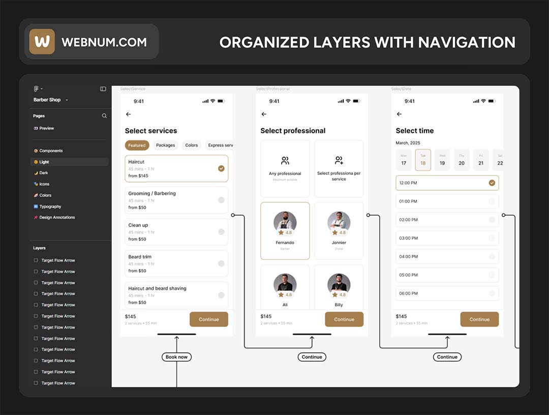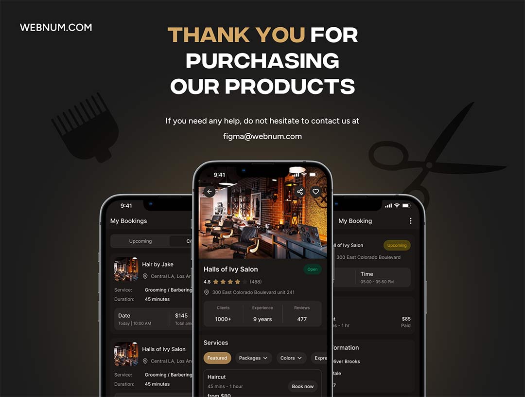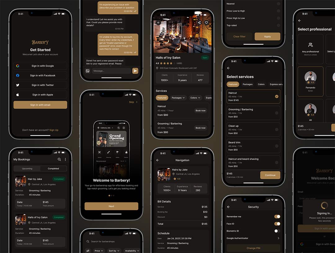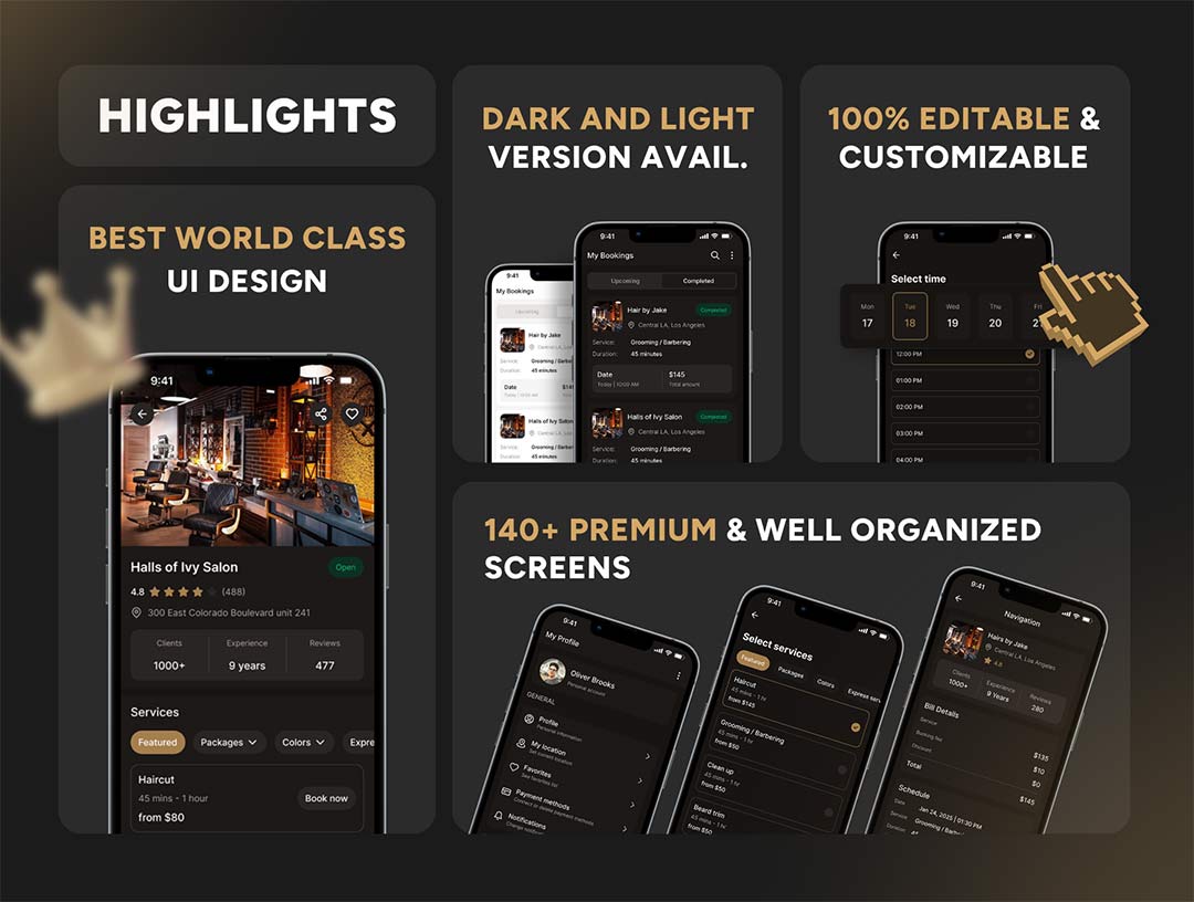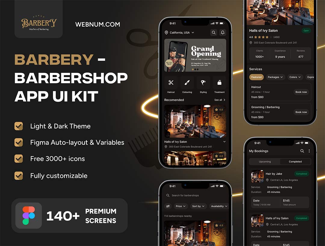 明暗共140页理发店、沙龙和美容服务app设计figma源文件