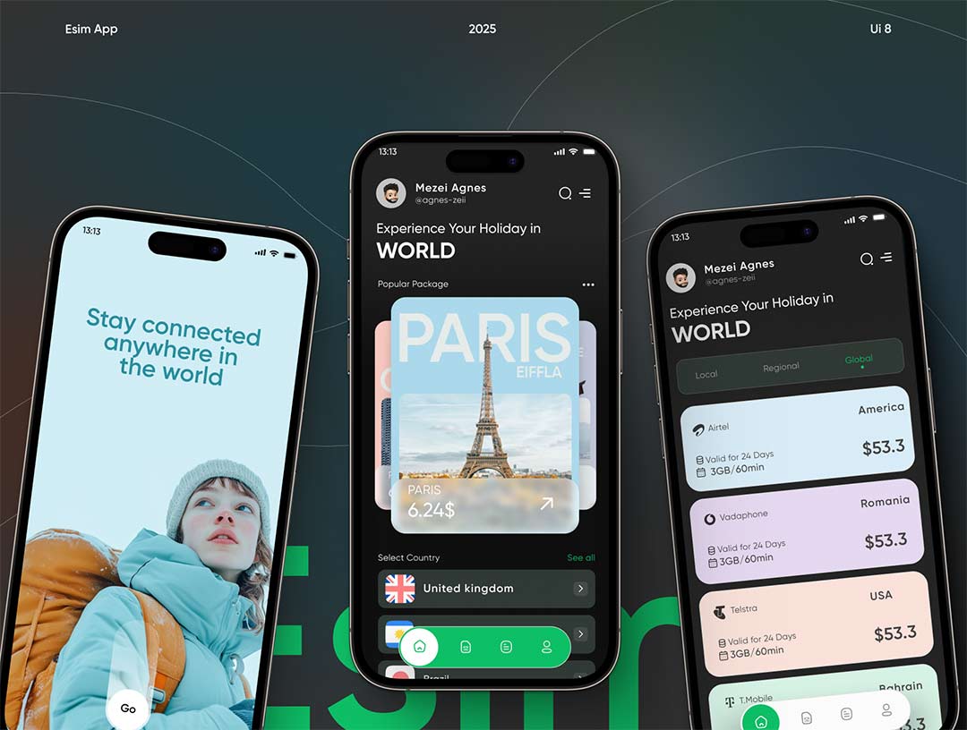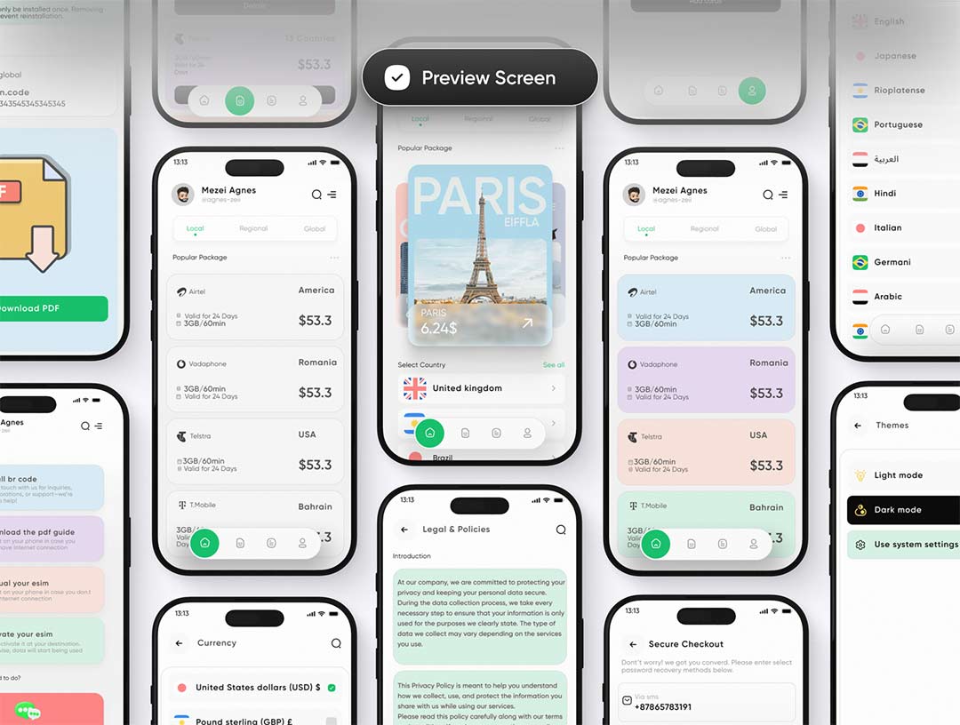 明暗共50页eSIM旅游解决方案app界面设计figma源文件
