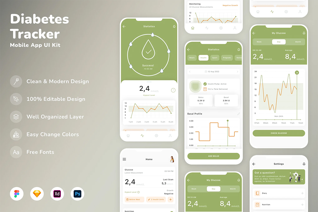 5页糖尿病追踪APP界面设计sketch,xd,figma,psd格式