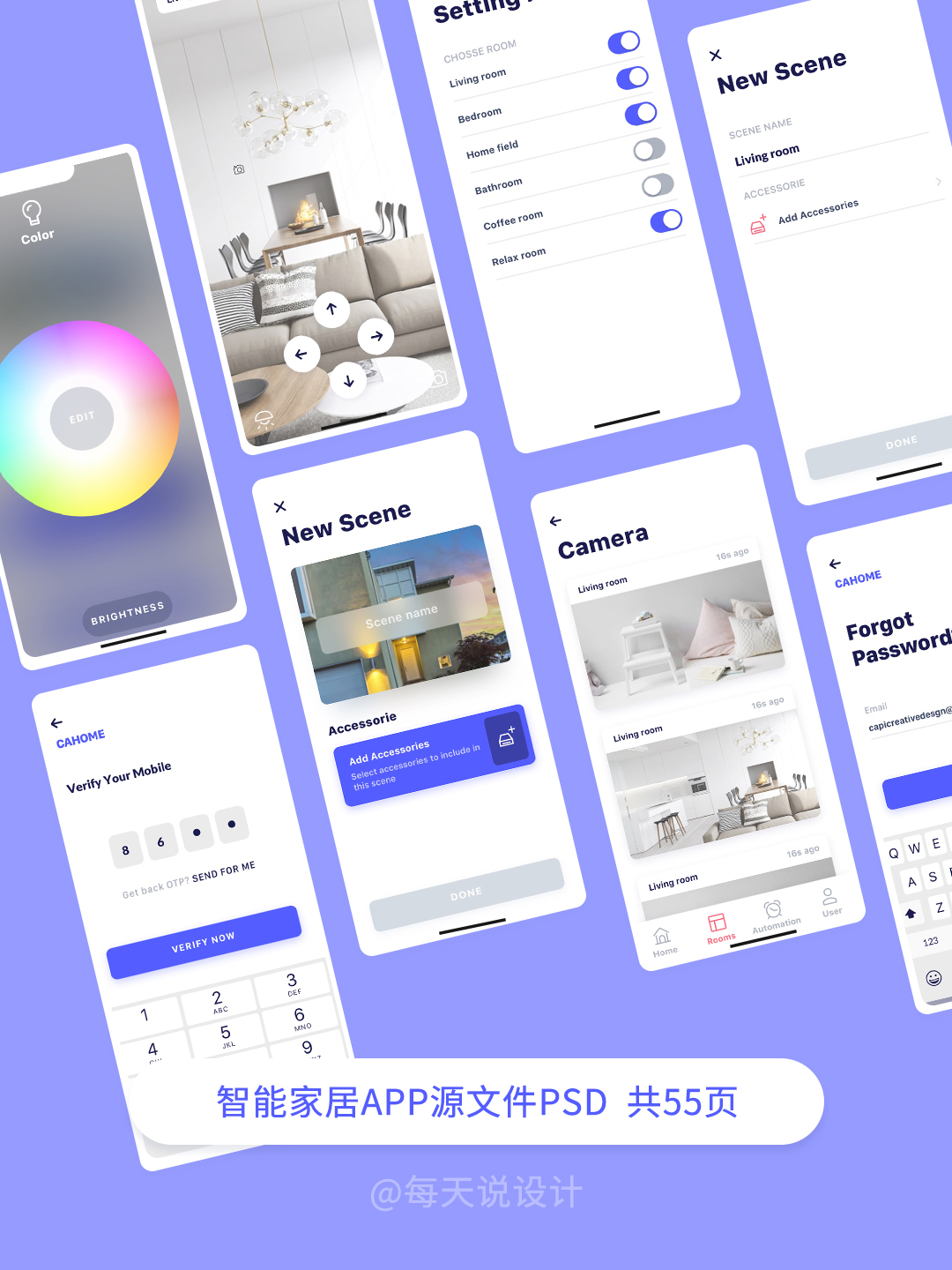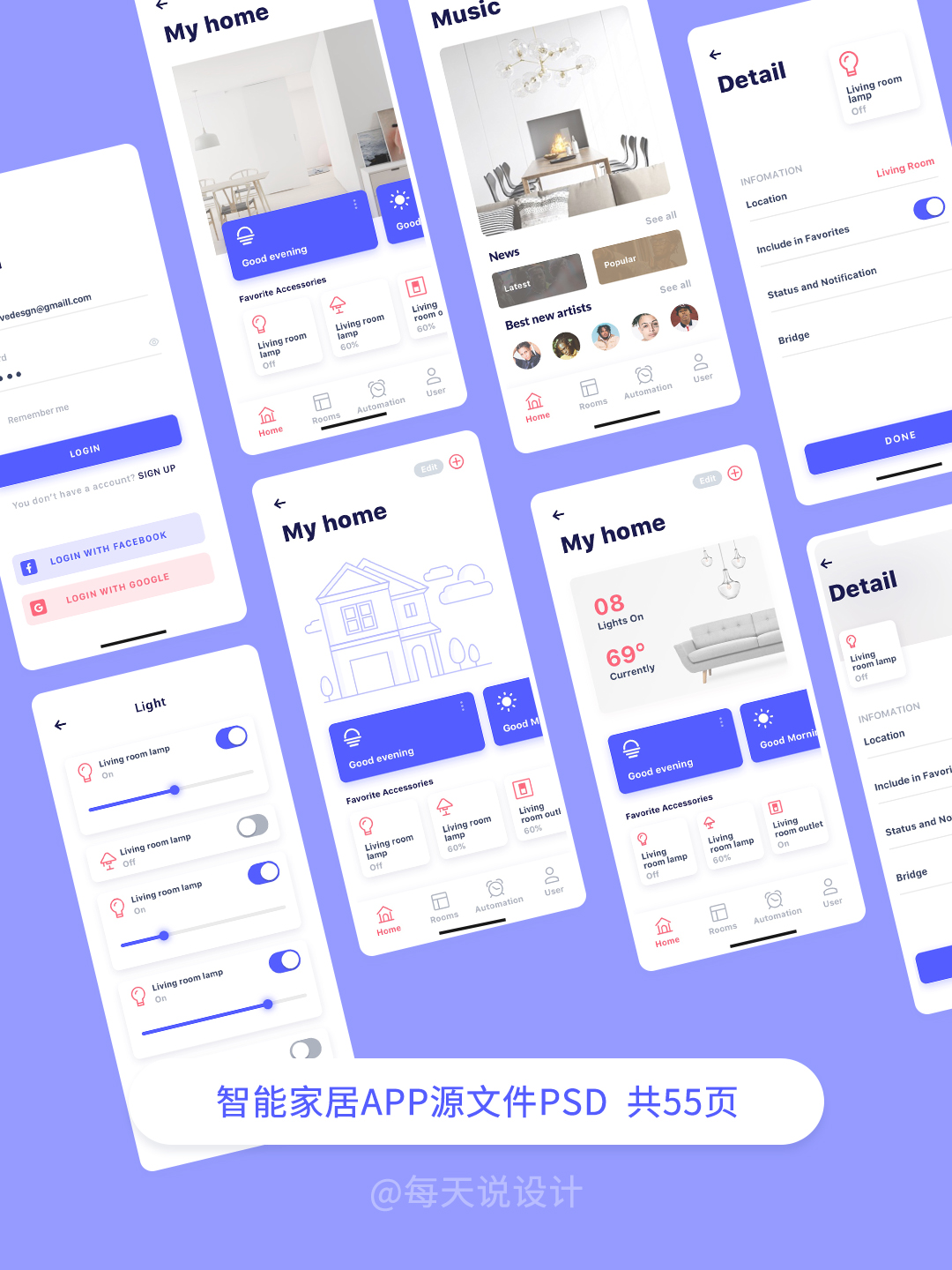 55页智能家居APP,智能家居APP设计源文件,包含登录注册、智能家电、设备开关、数据中心等,PSD格式文件分享!