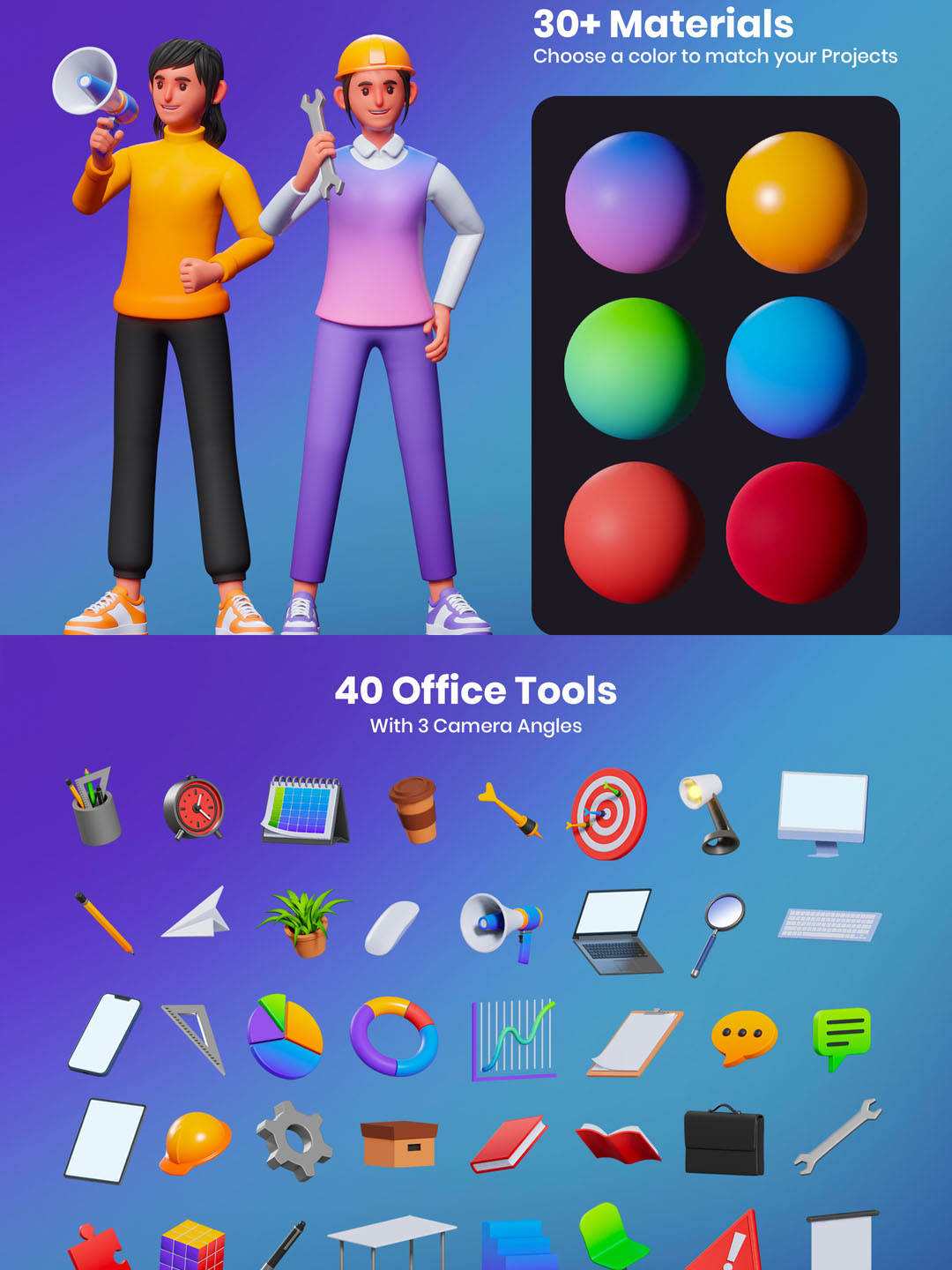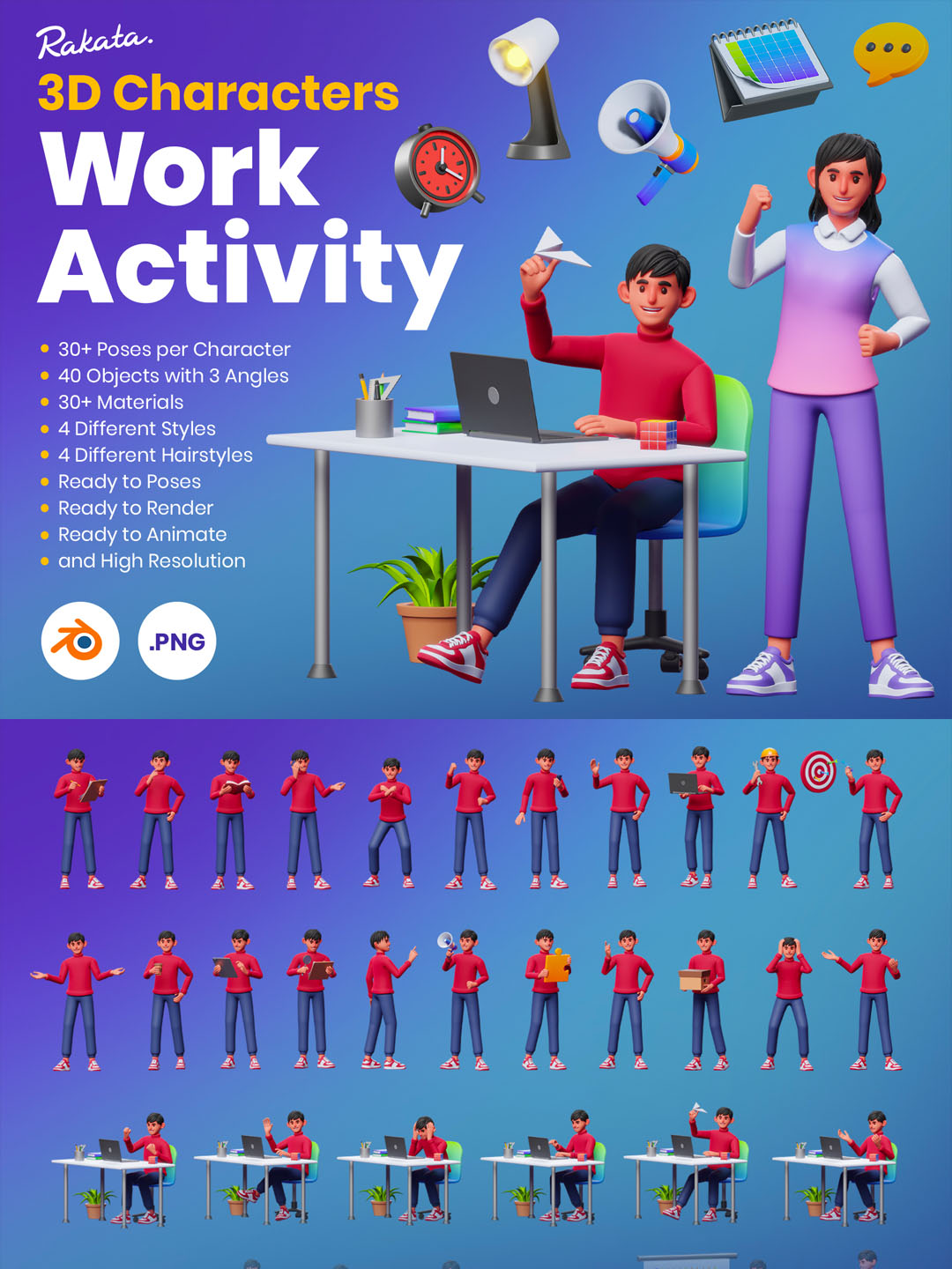 3D 角色工作活动包,每个角色有 30 多个姿势和 40 个 3D 对象。