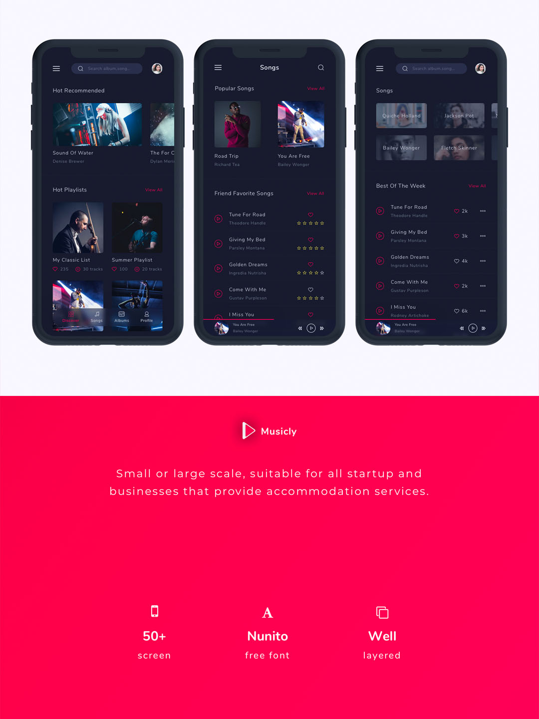 音乐和播客应用UI套件的设计符合现代设计趋势。小型或大型规模,适用于所有提供住宿服务的创业公司和企业。修改模板非常简单。