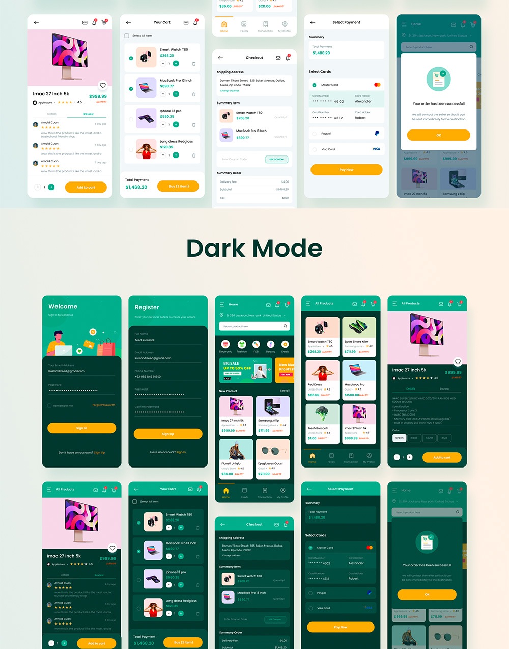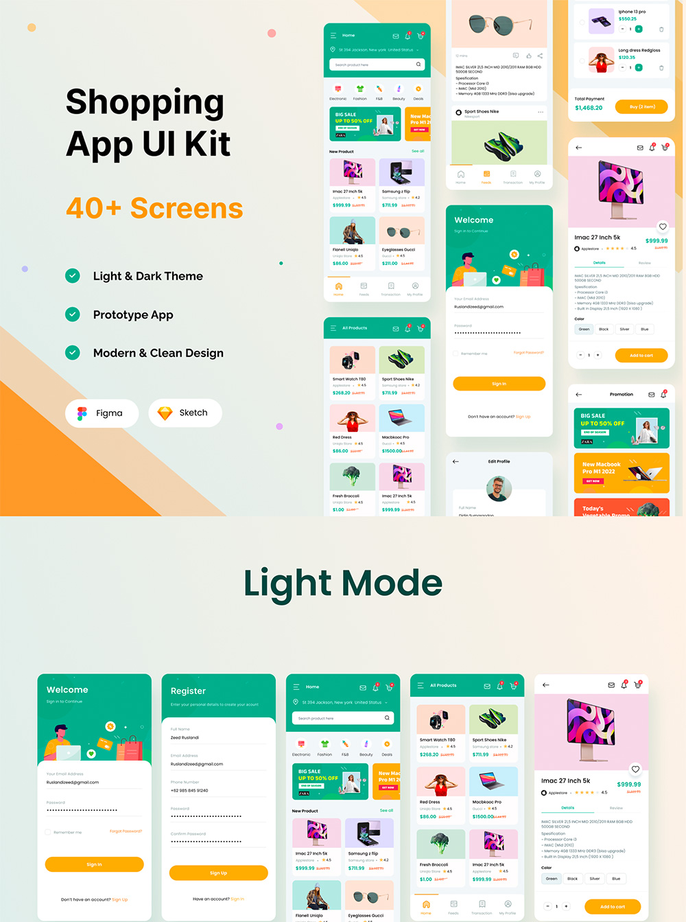Shopping 是一款高级和高质量的购物和市场 UI 工具包,具有 40 多个高质量页面,并且易于在 Figma 和 Sketchapp 中使用。提供明暗主题。
