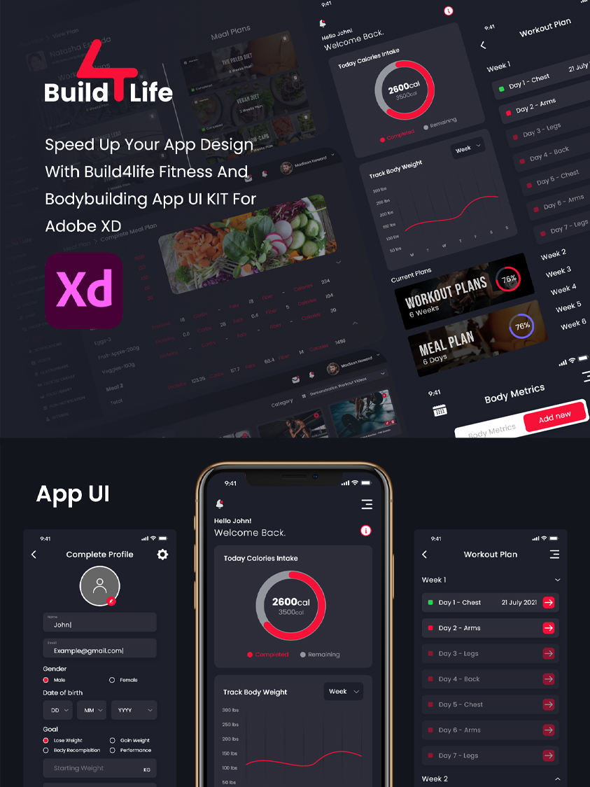 Build4Life 是一款健身和健美应用程序。此应用程序允许您创建自己的健身计划以满足您的需要。UI/UX 的设计考虑了健身和健美运动的所有必要需求。