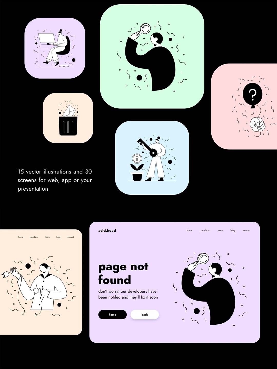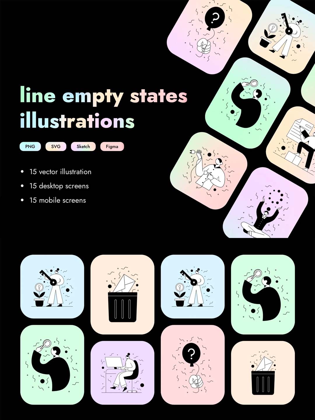 一套15个空状态UI插画黑白风格包含移动端与web端sketch,figma源文件