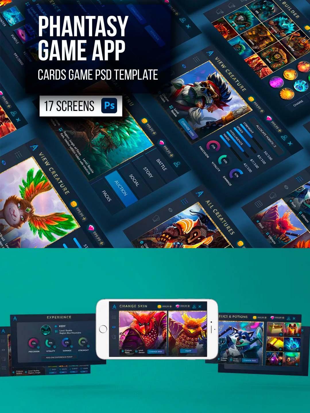 稀有暗黑主题卡片页面游戏App应用程序和UI套件模板,psd源文件