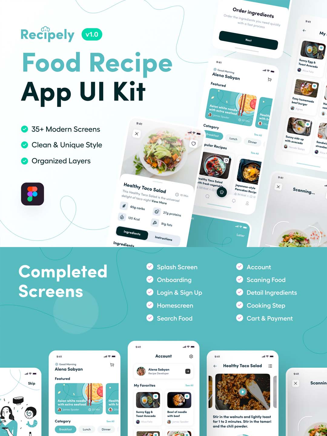 35页简约清新的食谱/美食app UI资源素材figma源文件下载
