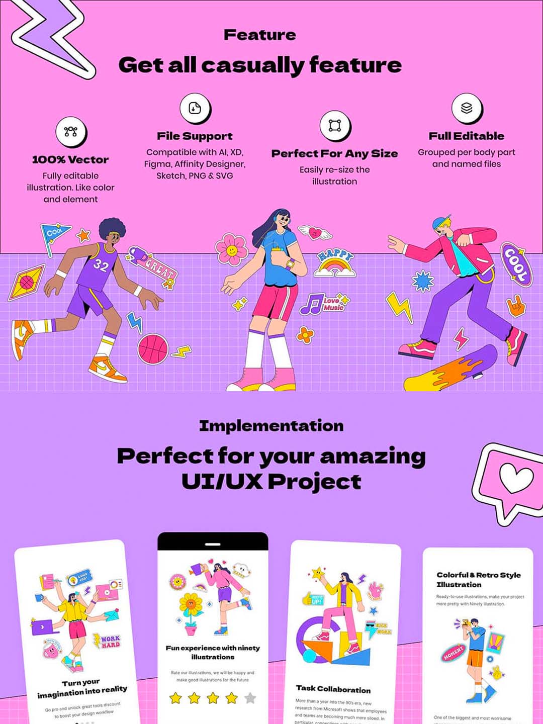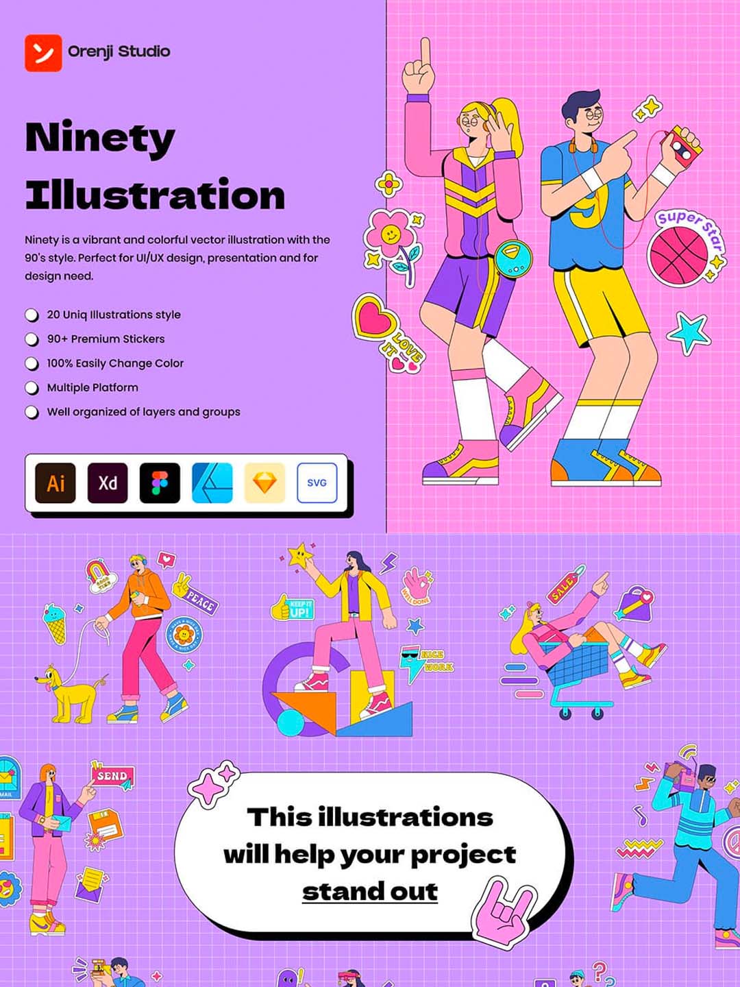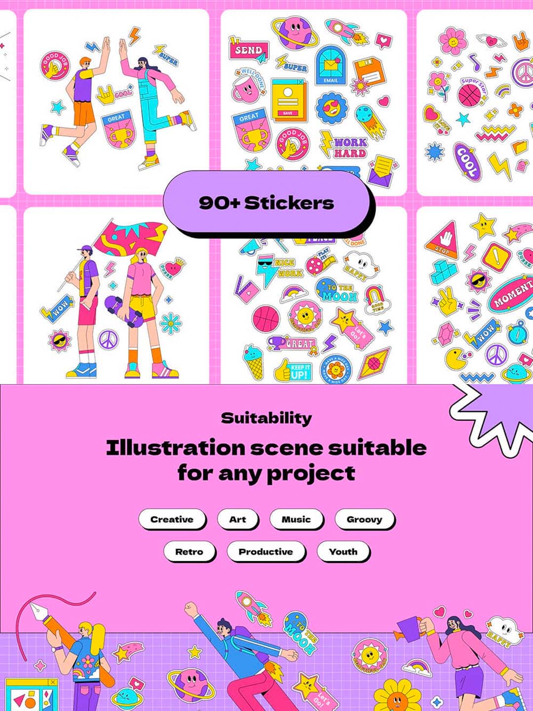90年代贴纸场景插画,流行复古风插画套装(含 ai,xd,fig,sketch,svg,afdesign)