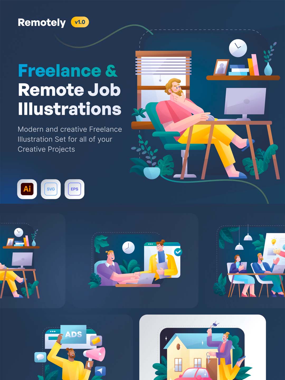 一套远程办公主题、居家办公主题自由职业者矢量插画素材包ai源文件