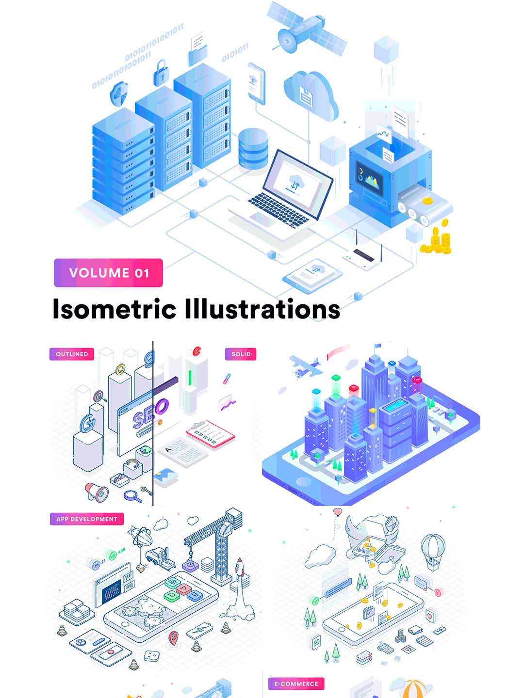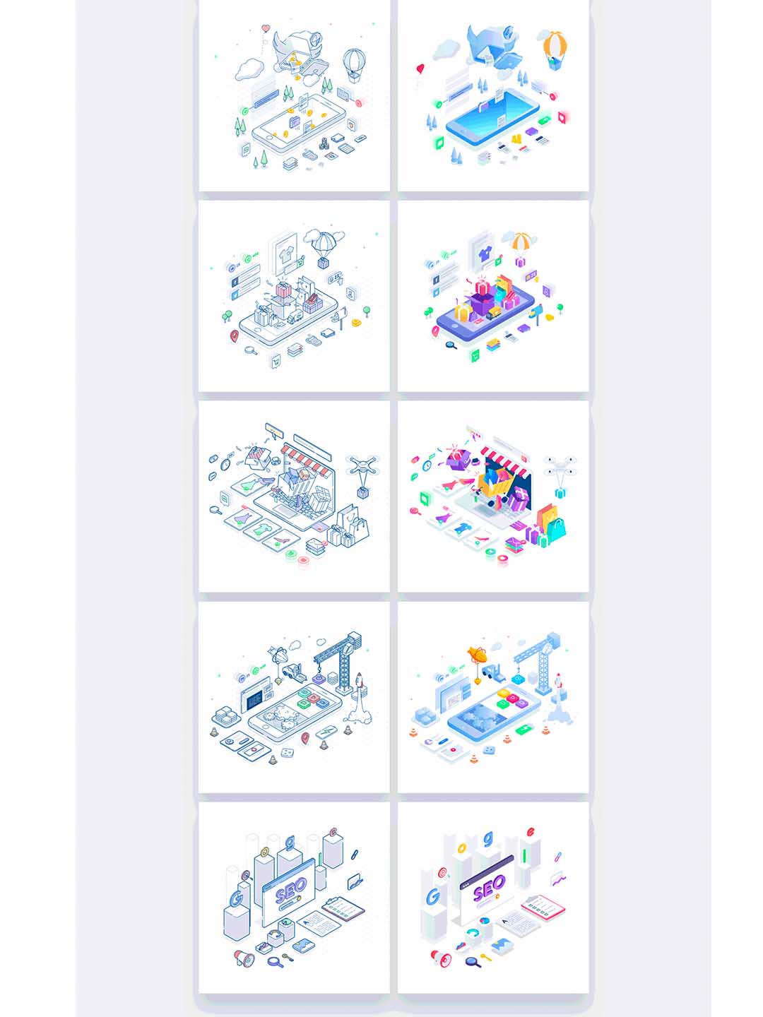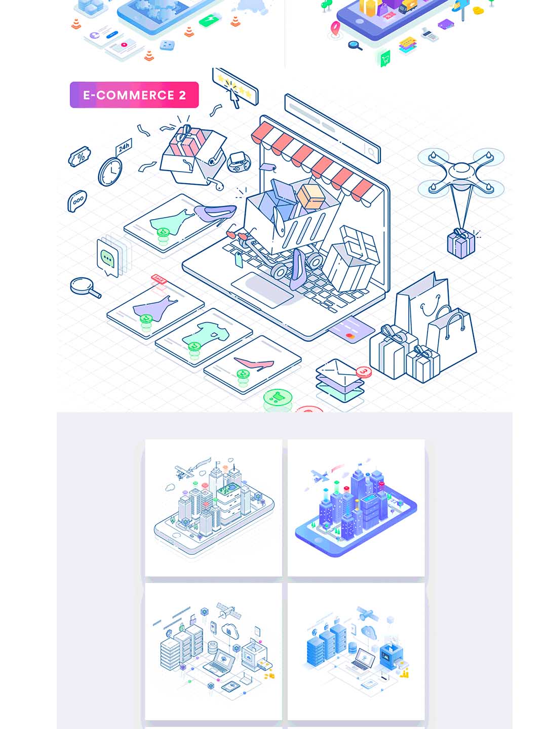 一组2.5D现代城市时尚风格运营插画ai源文件下载,2.5D矢量插画科技、云服务运营场景插画
