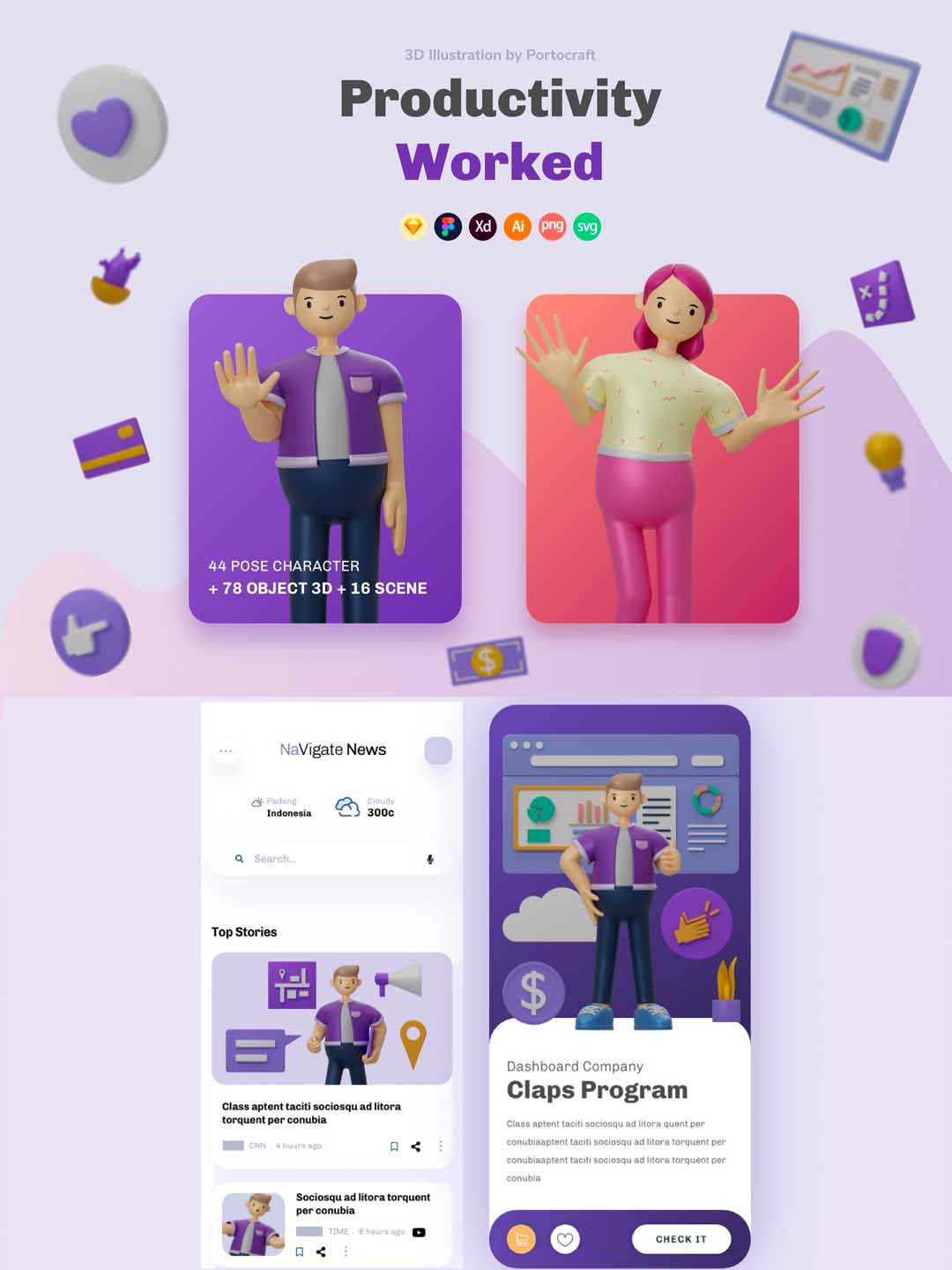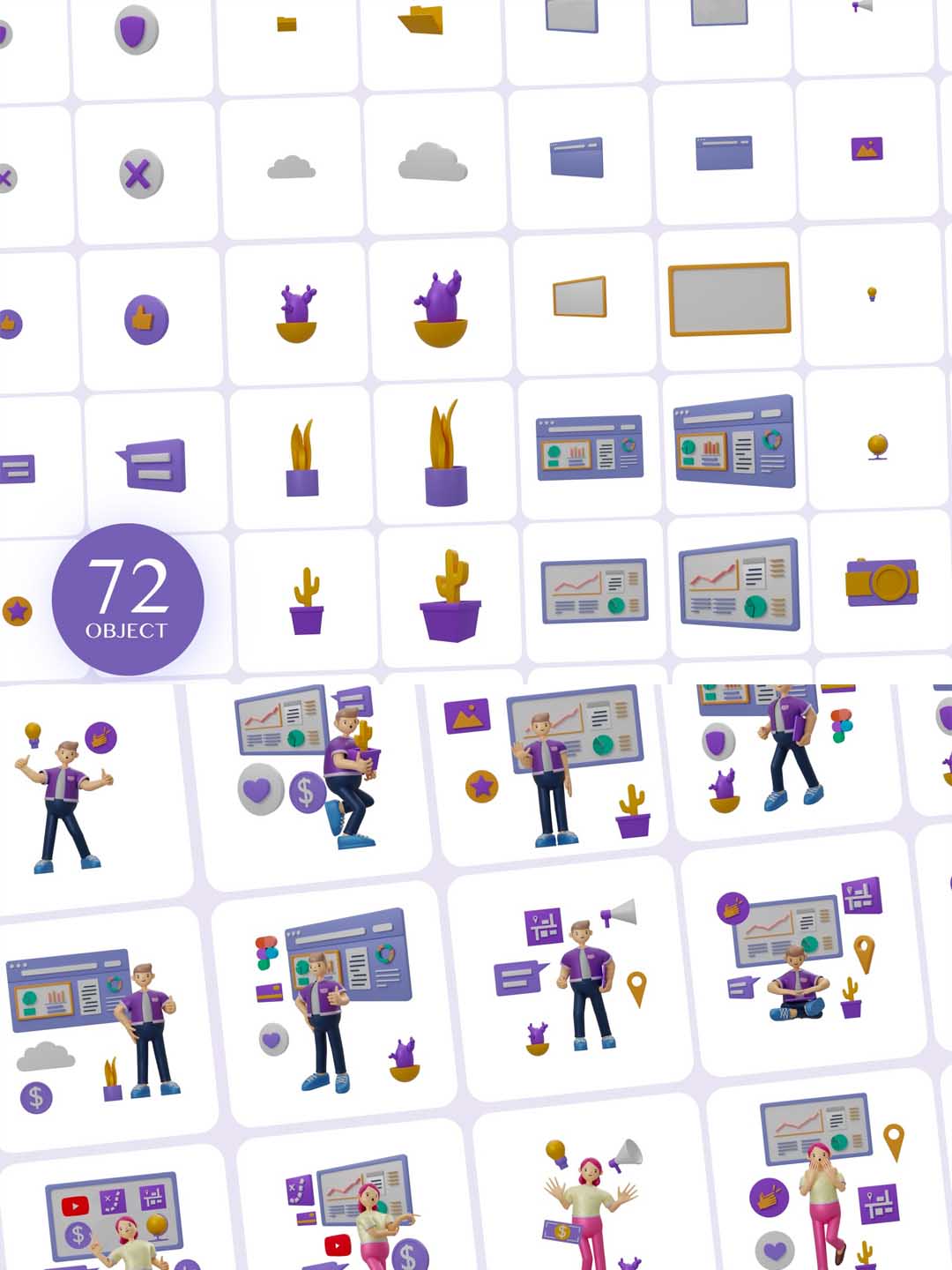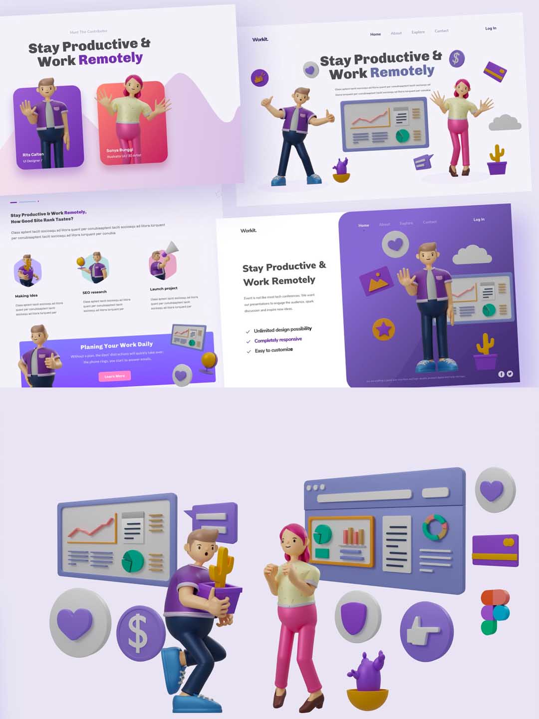 一套3D插画资源工具包,包含42个姿势3d人物3d工作场景插画素材包下载