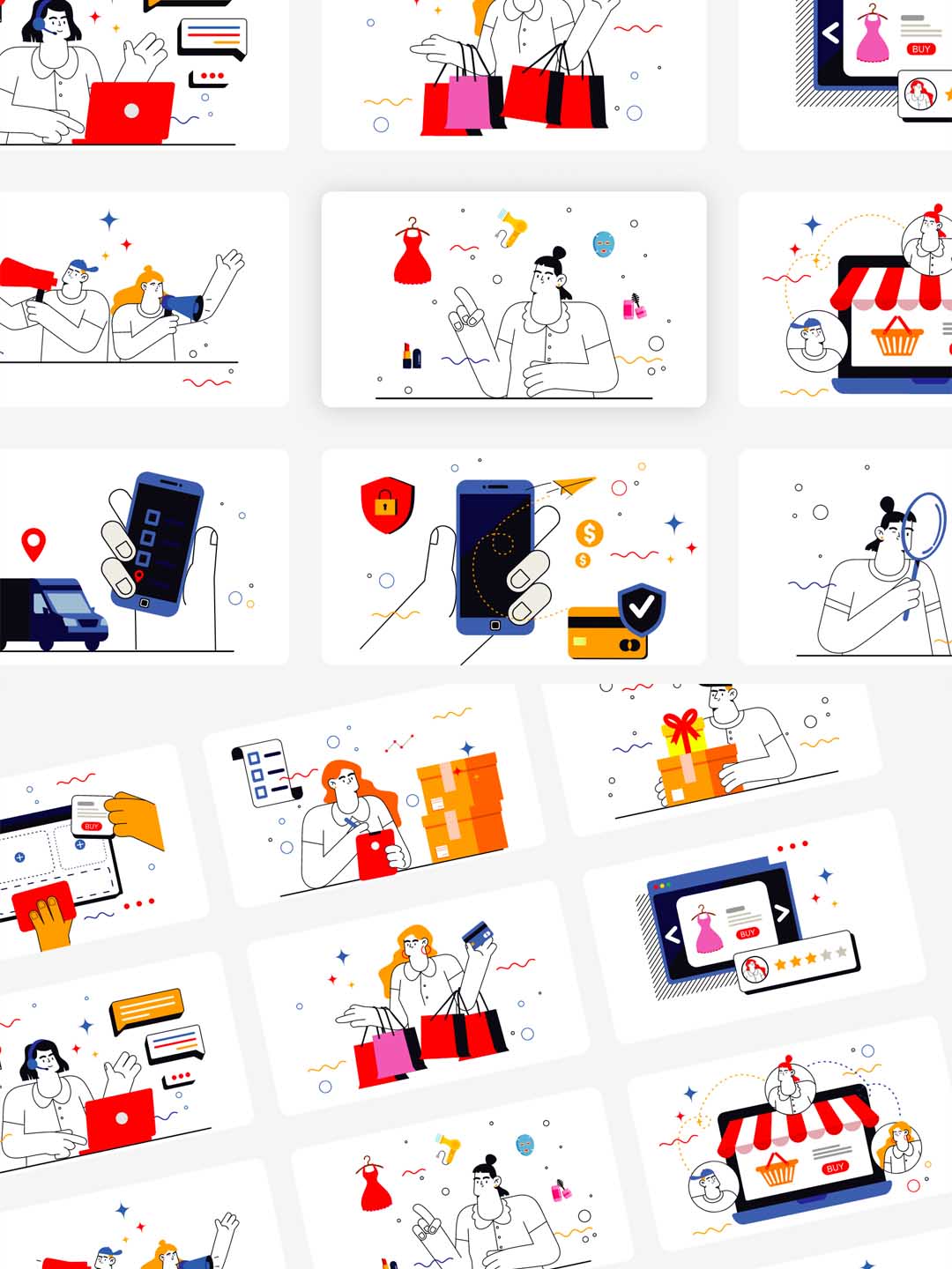 一套有特色的矢量线条风格插画运营套件ai源文件,矢量运营插画适用于电商场景的矢量插画UI素材