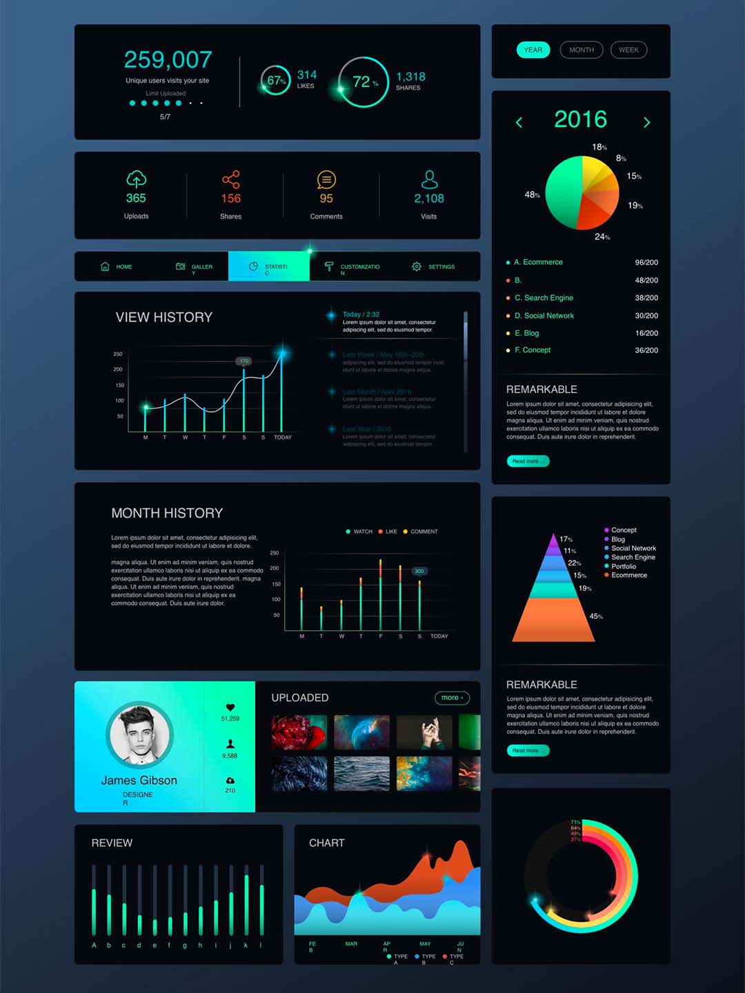 UI设计师必备:超全色彩丰富仪表板用户界面工具包、数据可视化sketch下载