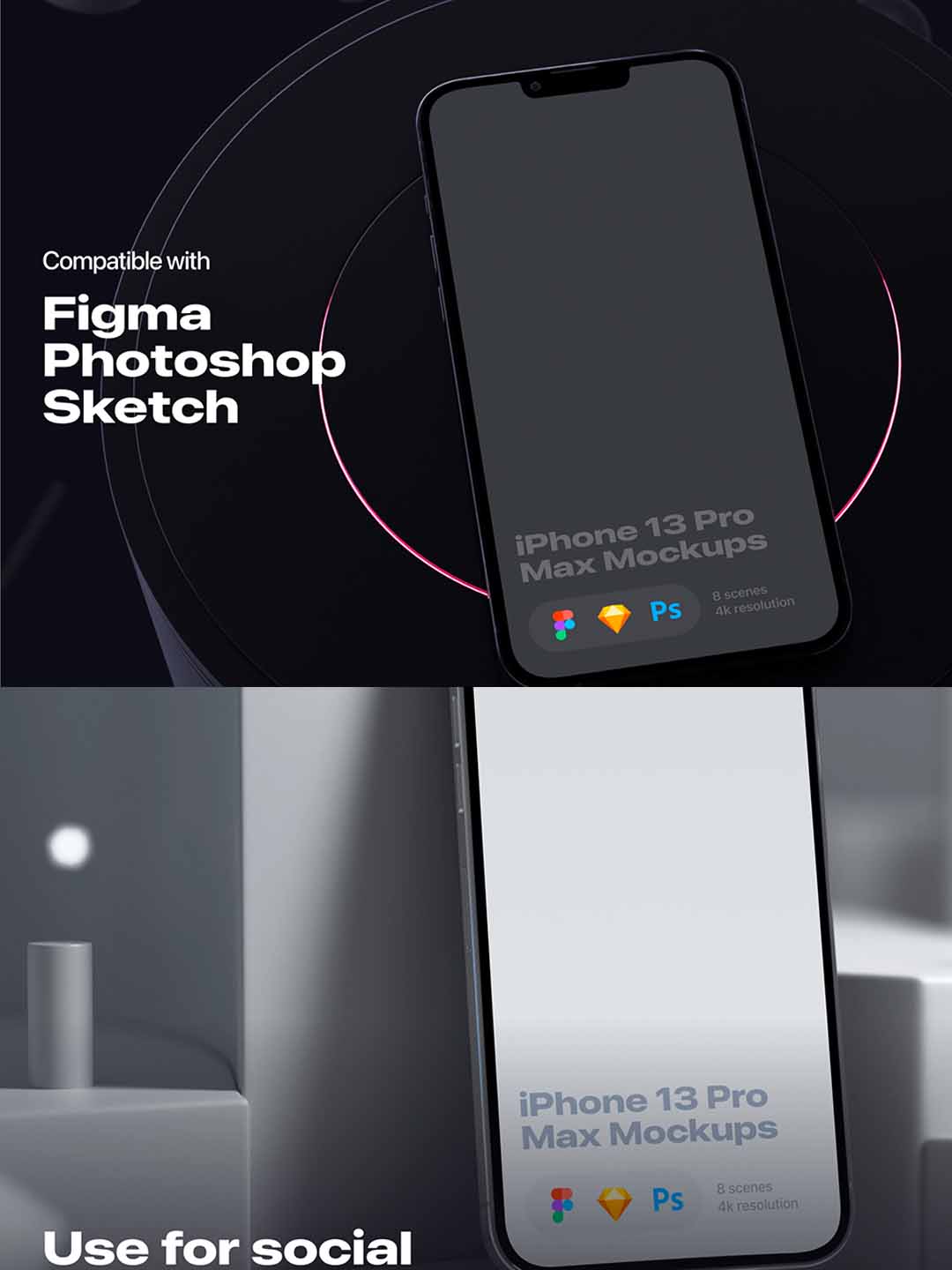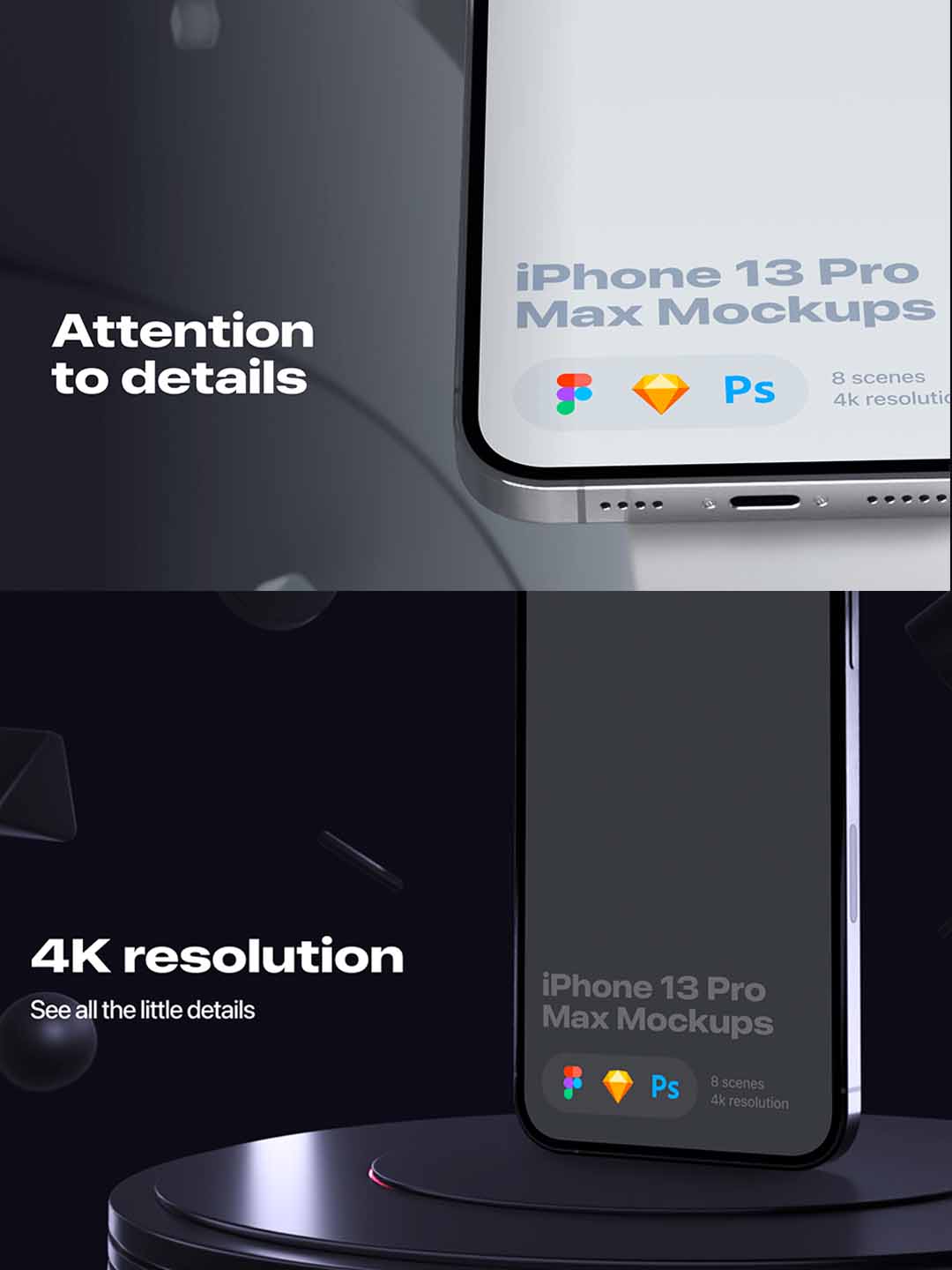 8个不同角度高清分辨率iPhone 13 Pro Max样机mockup模板fig,sketch,psd源文件