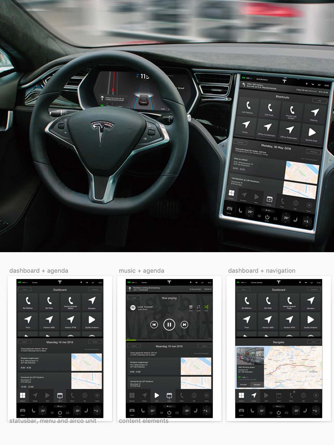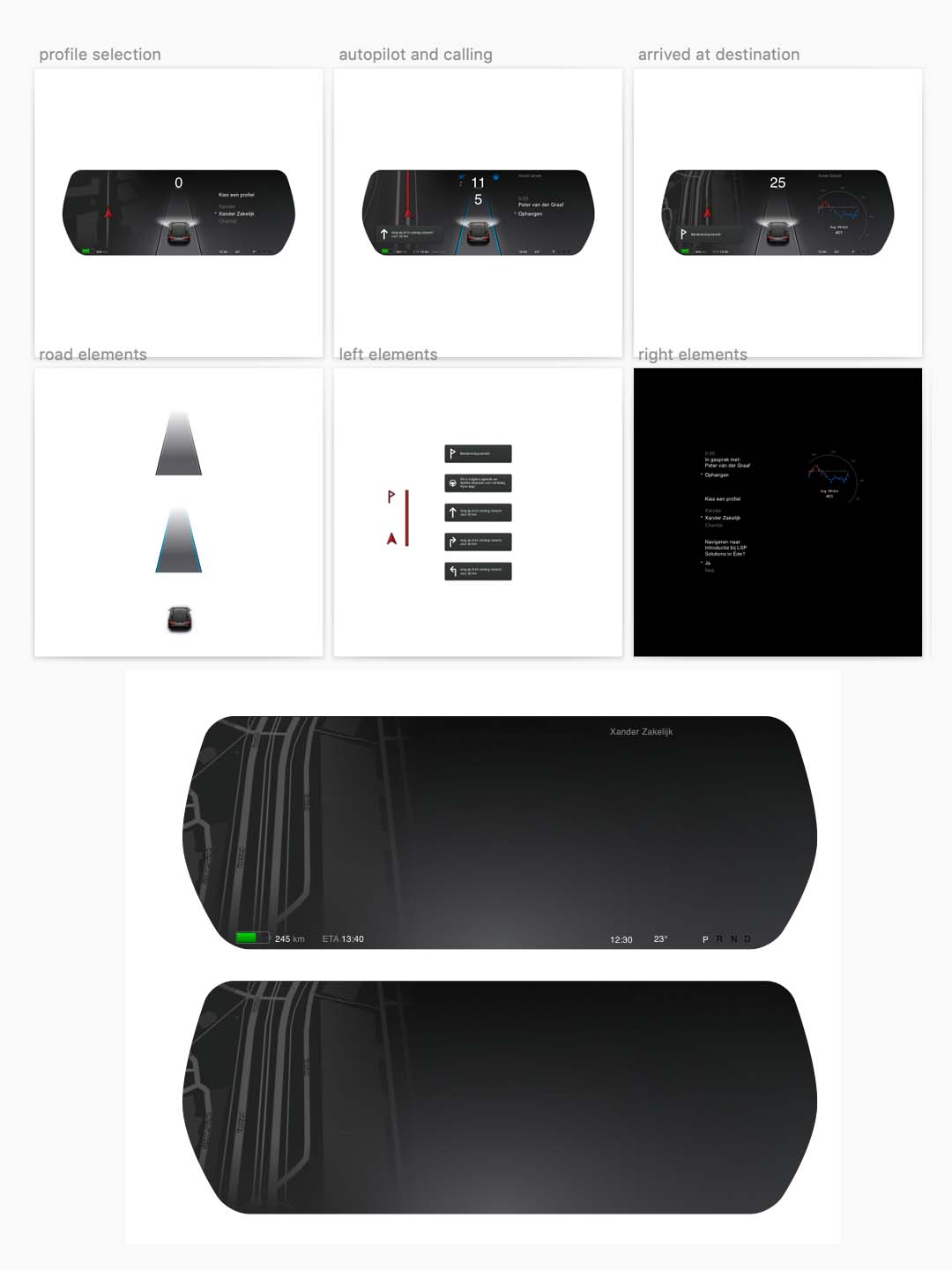 Tesla Model 3 sketch资源,元素包括:主控制栏、音乐播放器、地图、导航小部件、车道辅助、车辆状态