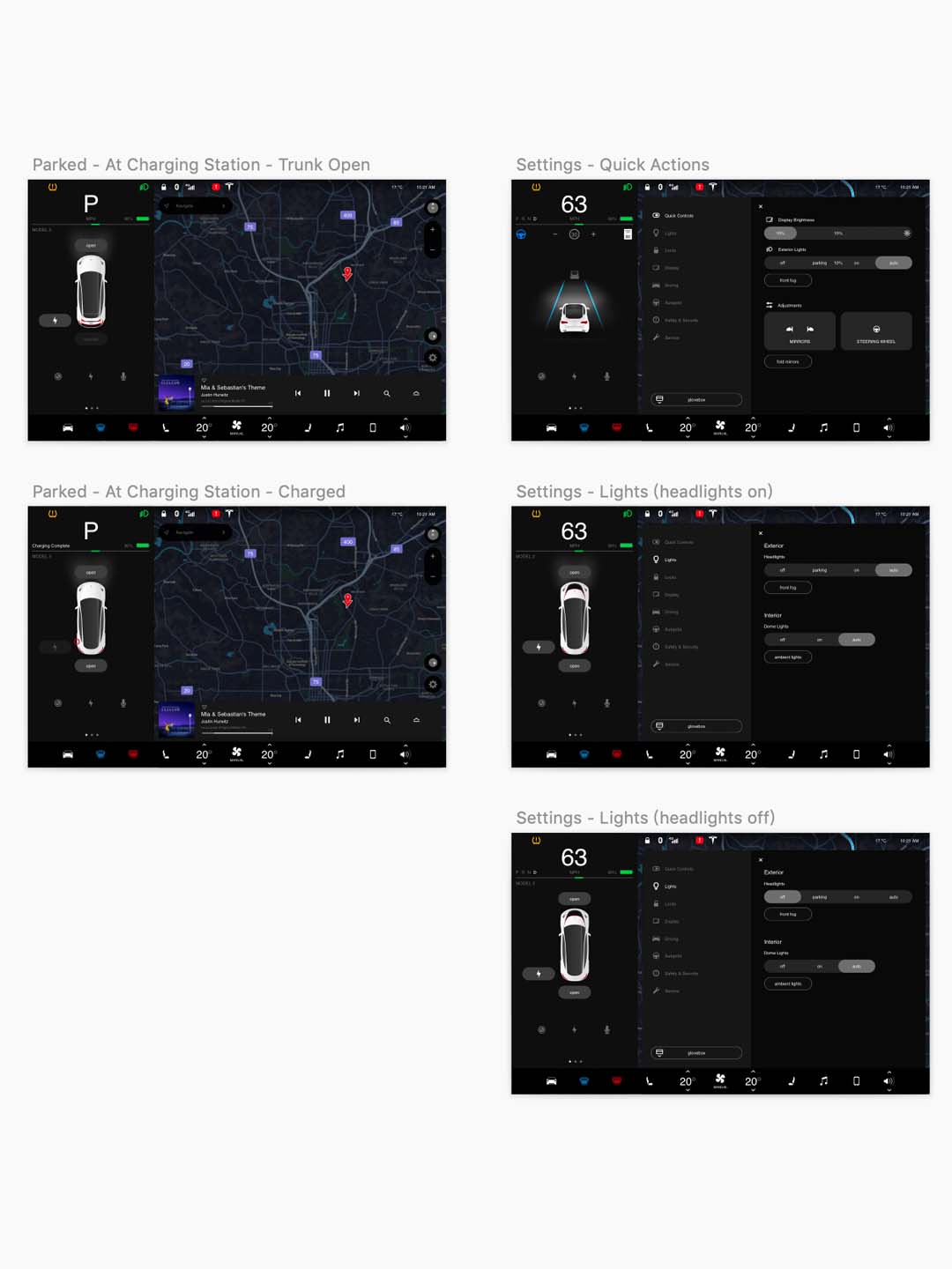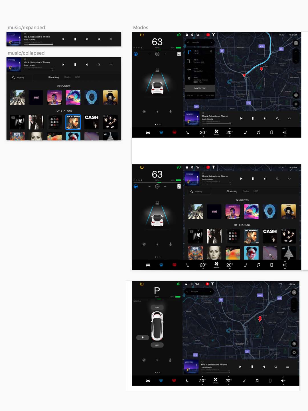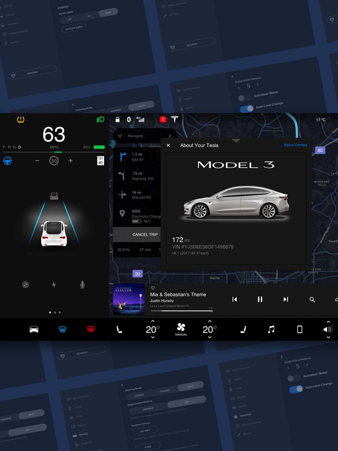 Tesla Model 3 sketch资源,元素包括:主控制栏、音乐播放器、地图、导航小部件、车道辅助、车辆状态