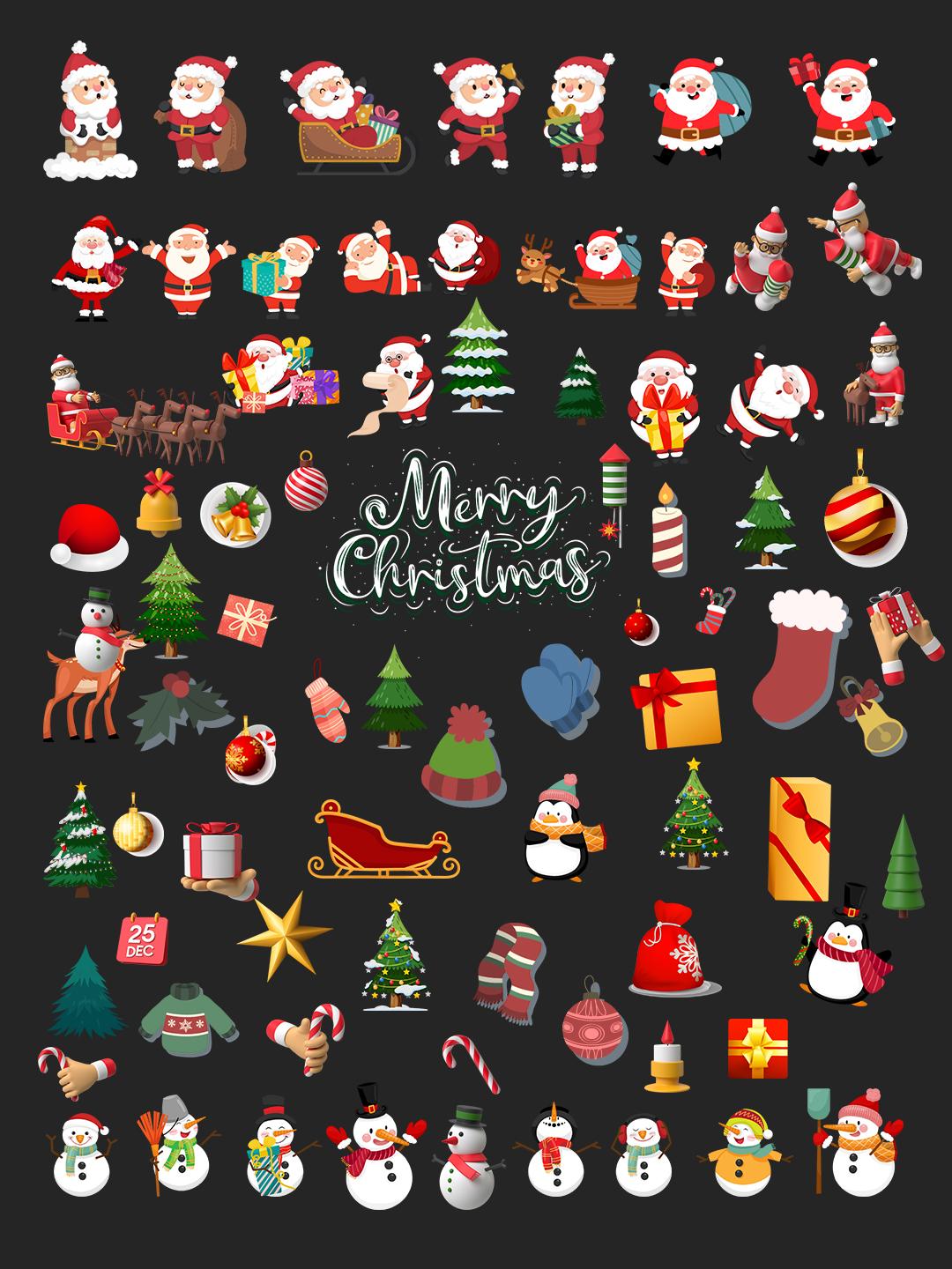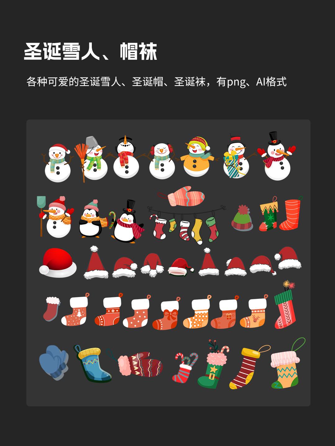 圣诞老人、圣诞树、圣诞袜、圣诞帽、圣诞雪人、姜饼屋、