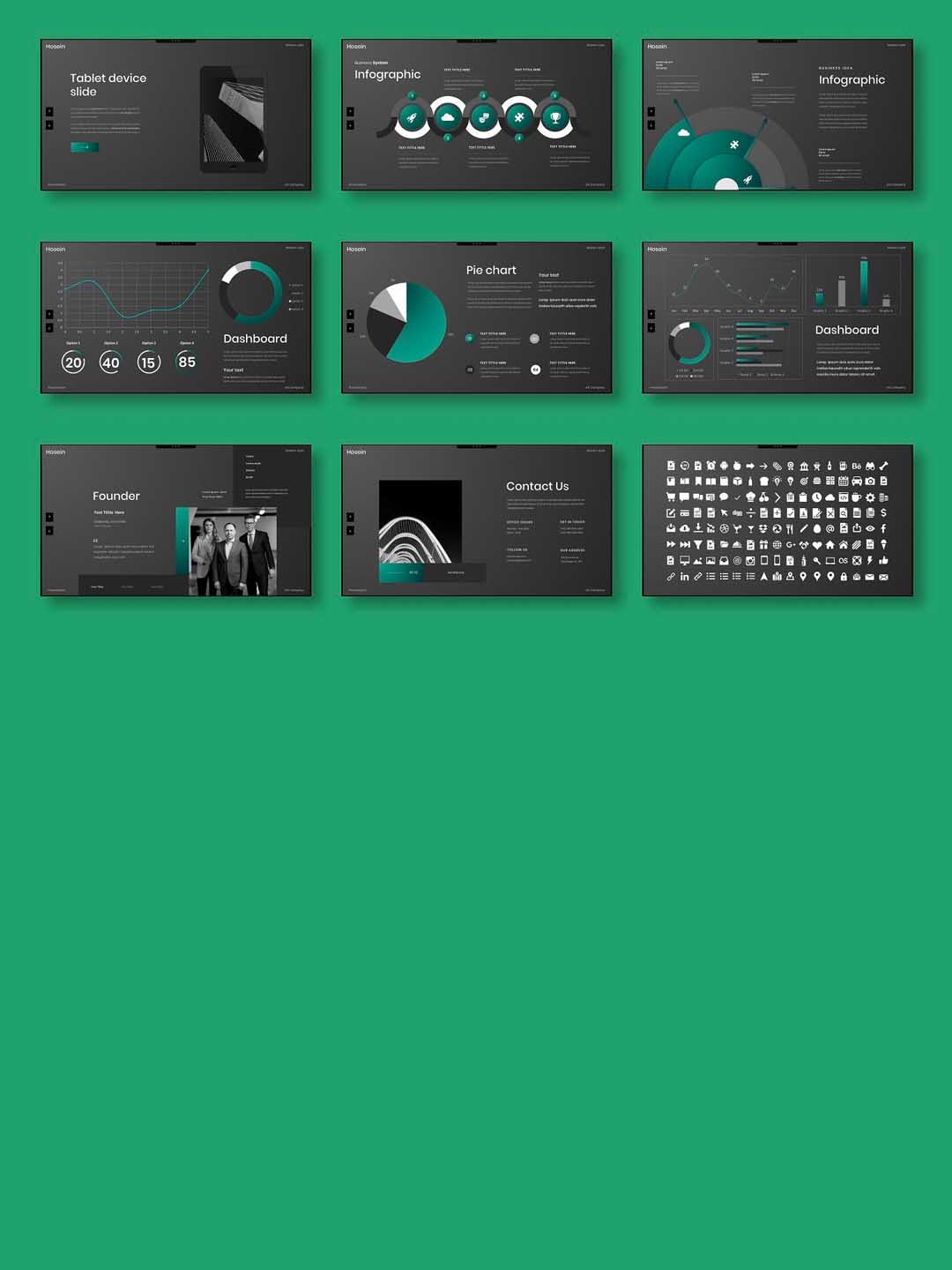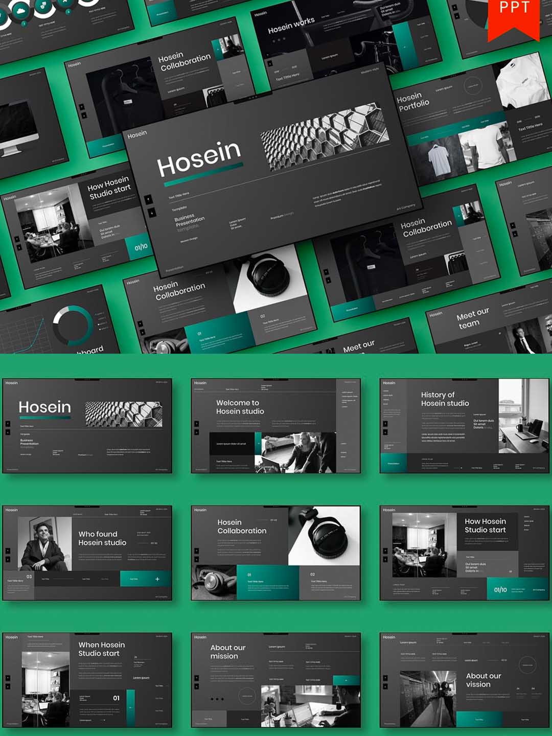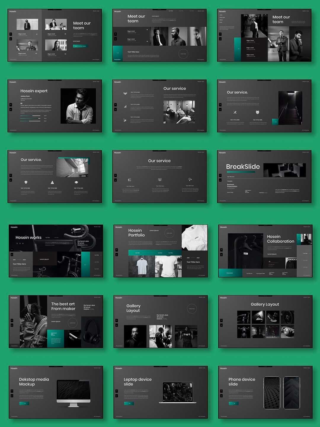 暗色系高端个人作品集包装展示PPT幻灯片模板、黑色高端格调UI作品集ppt模板商业幻灯片模板