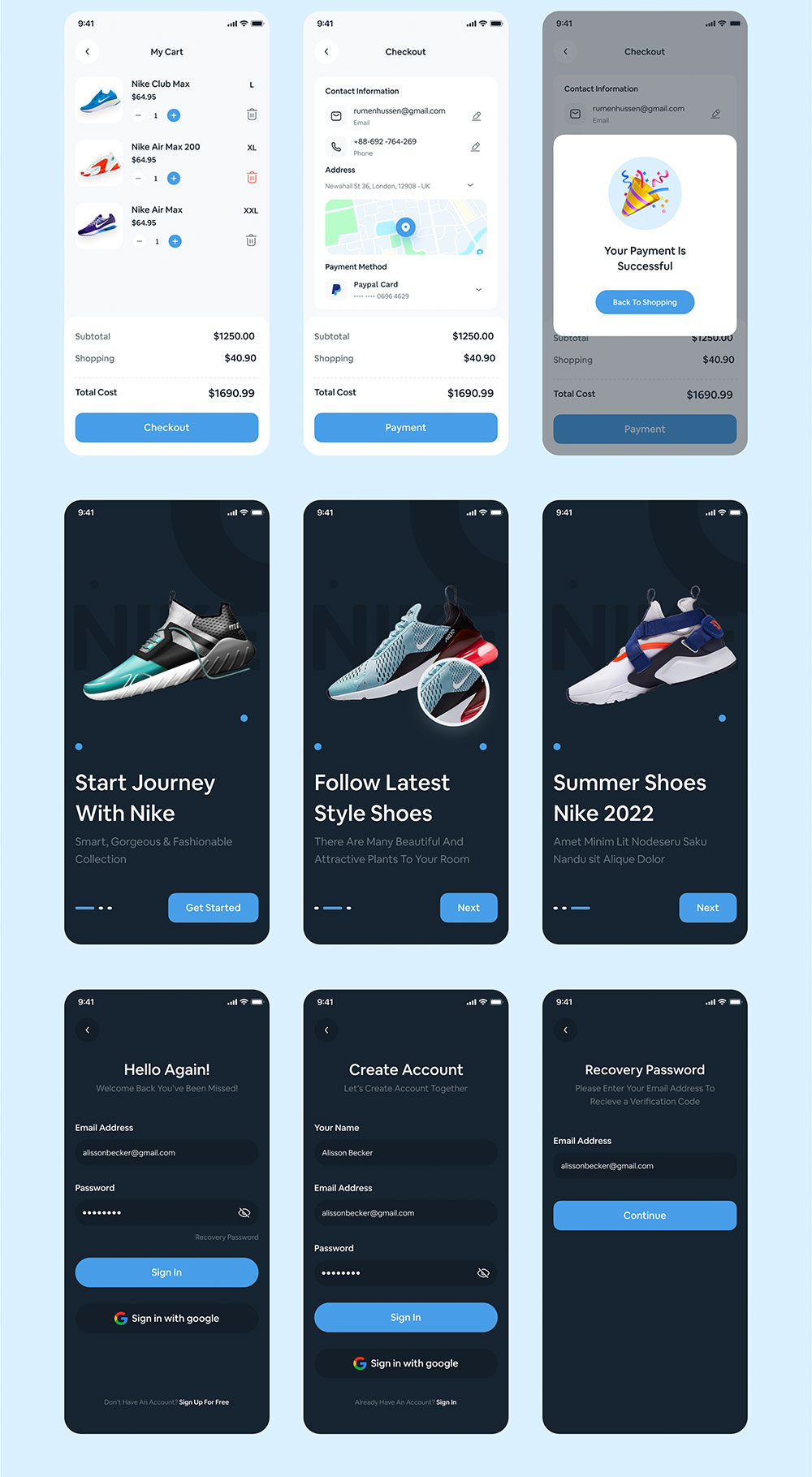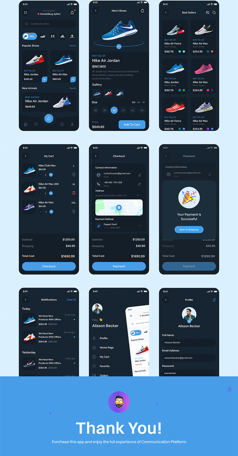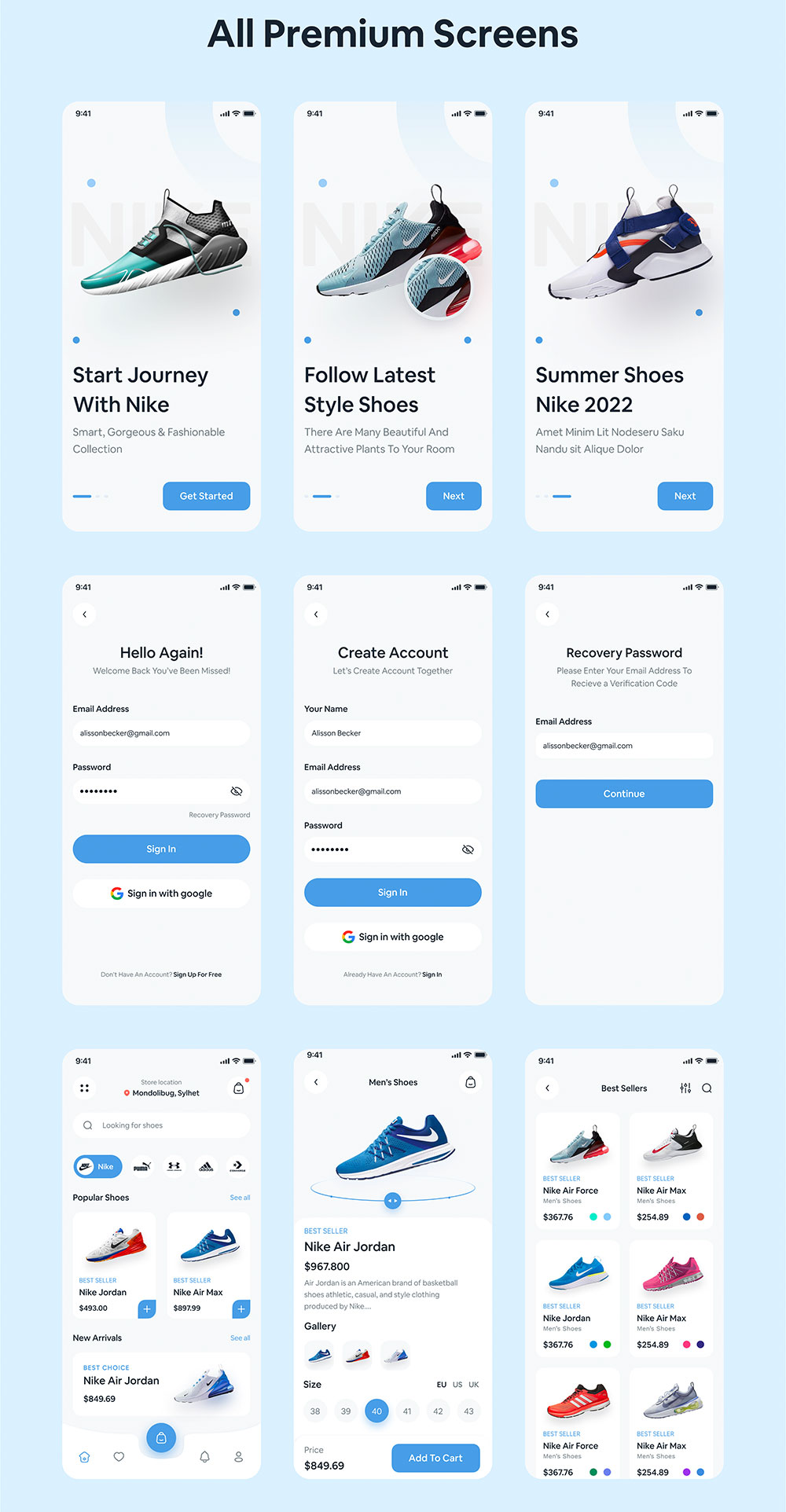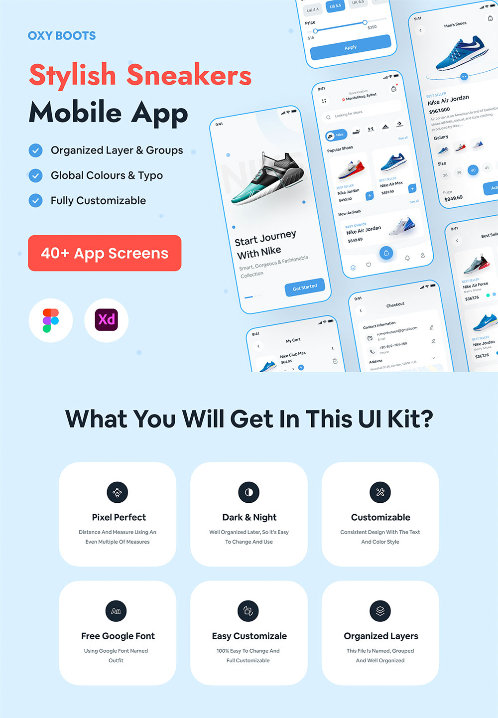 鞋子应用程序UI工具包是一个完整的,可定制的iOS移动应用程序解决方案,帮助您为客户创建一个美丽的,现代的鞋子购物体验。鞋子应用程序UI套件是创建专业和现代外观的鞋子购物应用程序的一个好方法。套件包括各种UI元素和图标,对任何鞋子购物应用程序都是完美的。套件是完全可定制的,可以轻松适应任何配色方案或品牌。它提供了所有品牌鞋及其规格的详细清单。它包括40多个免费屏幕,很容易改变颜色。下载并享受应用程序。可在Figma和XD。