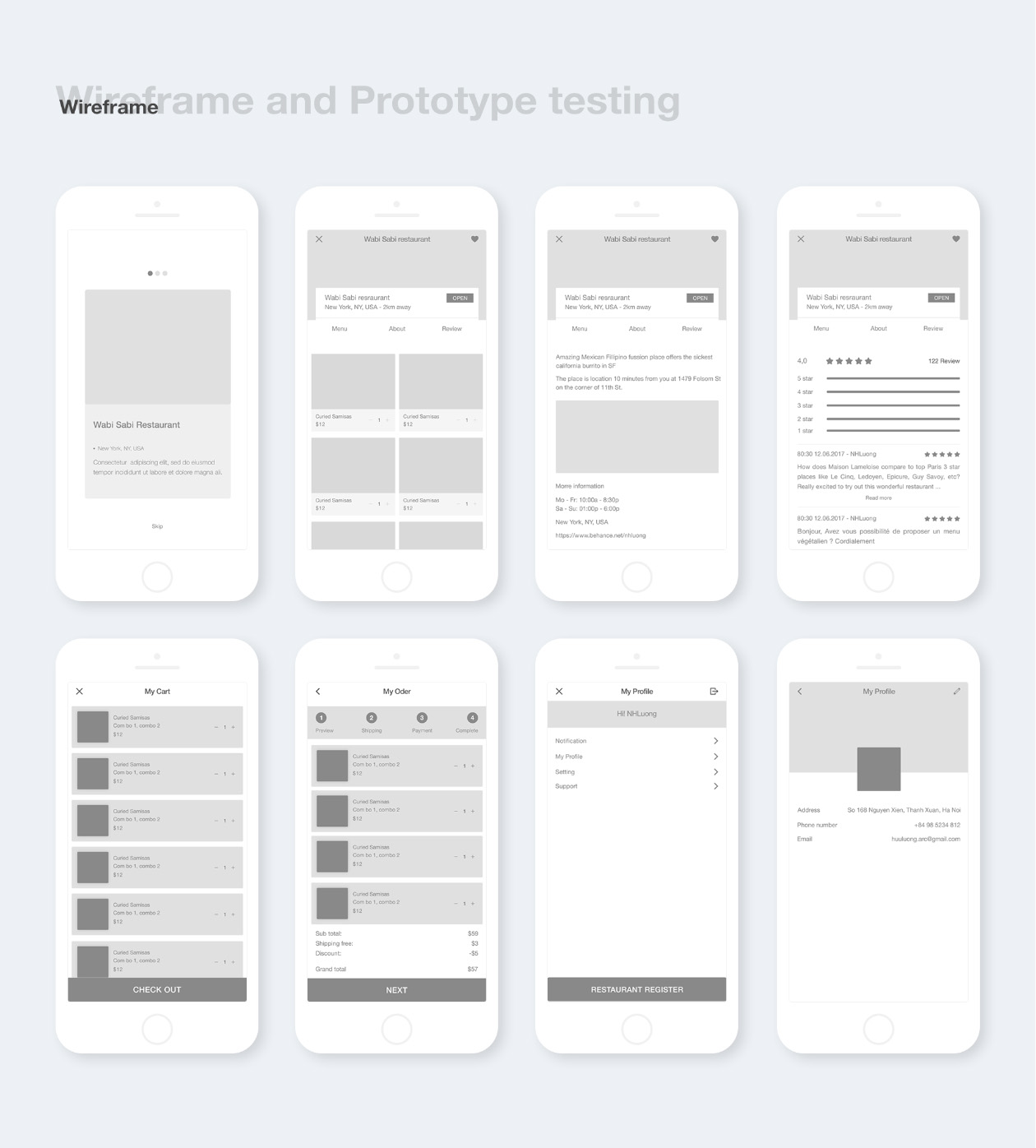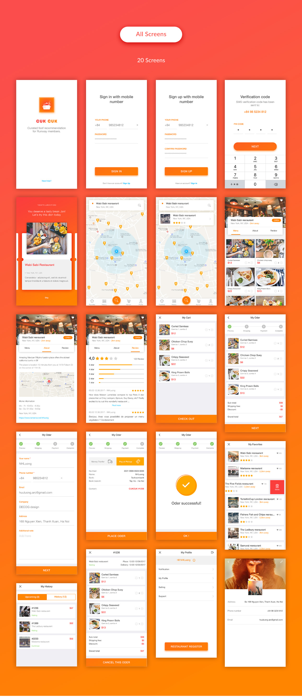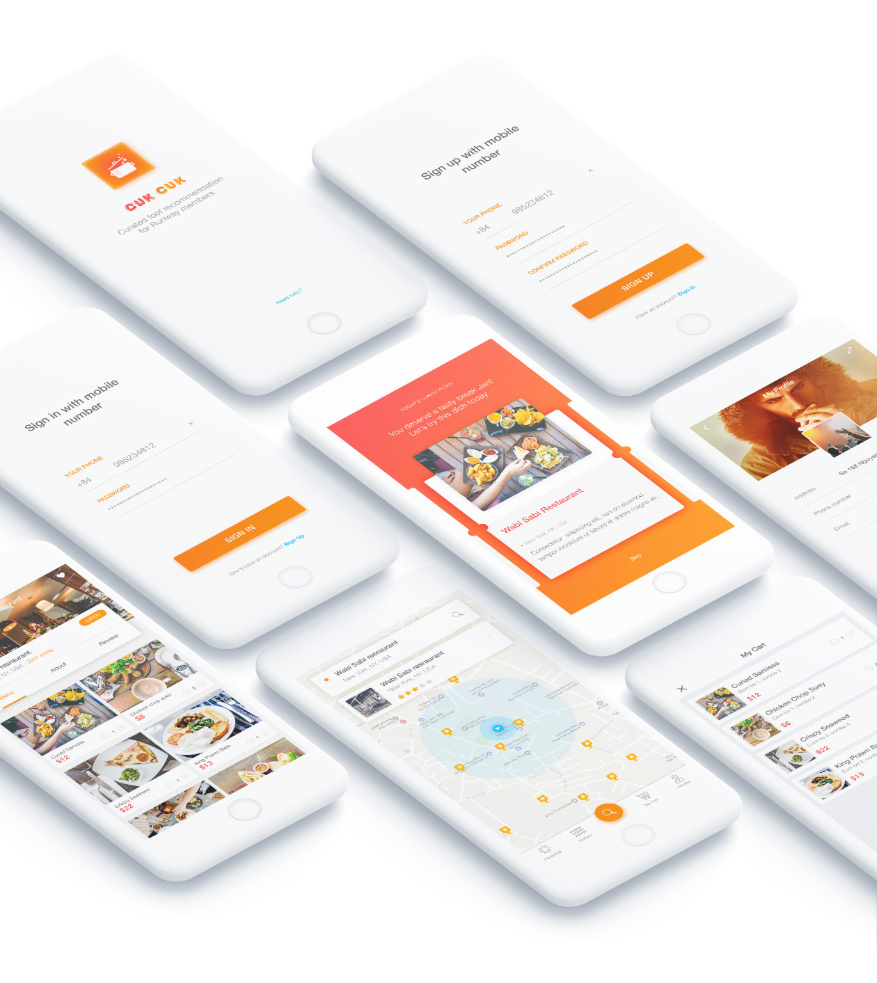 Cook 是一款餐厅概念应用程序,可帮助用户找到附近区域的餐厅。它允许用户在线订购和支付。这些屏幕包括地图、购物车、结账、支付页面和用户资料。