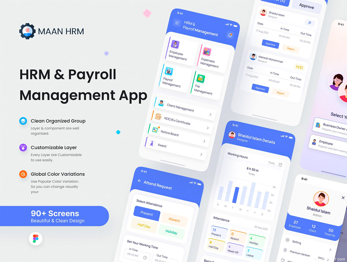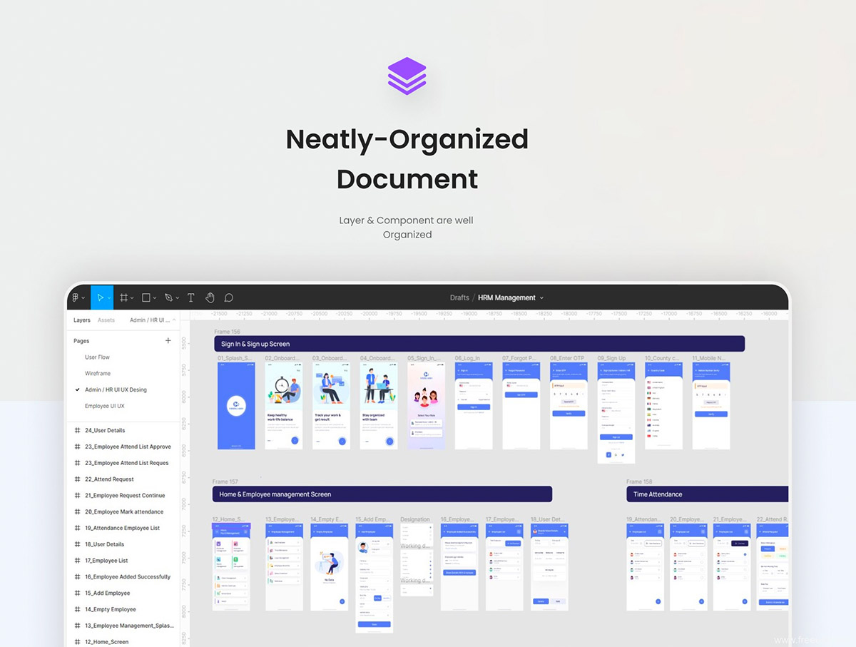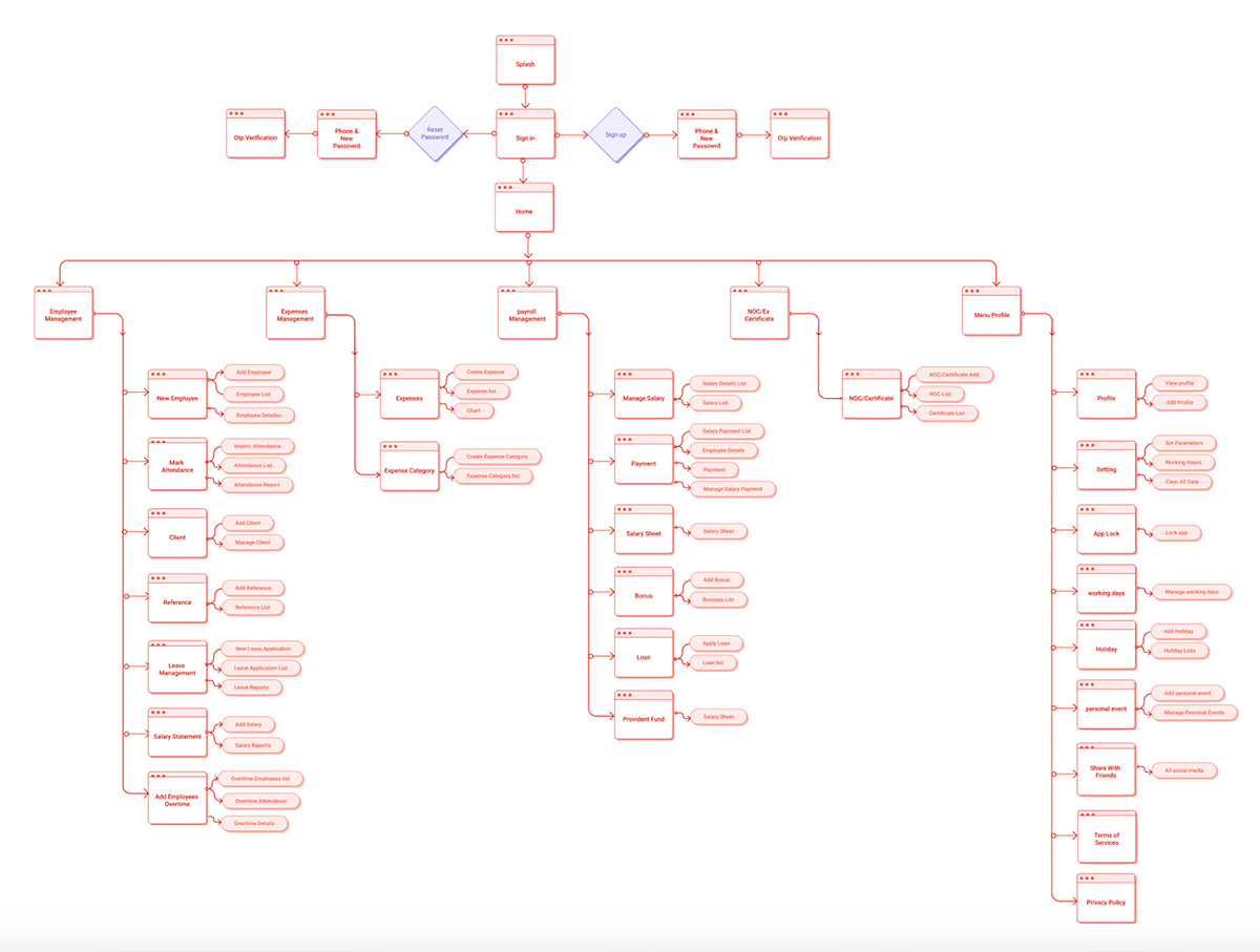 90页人力资源管理App应用程序UI套件,包含流程图和原型图