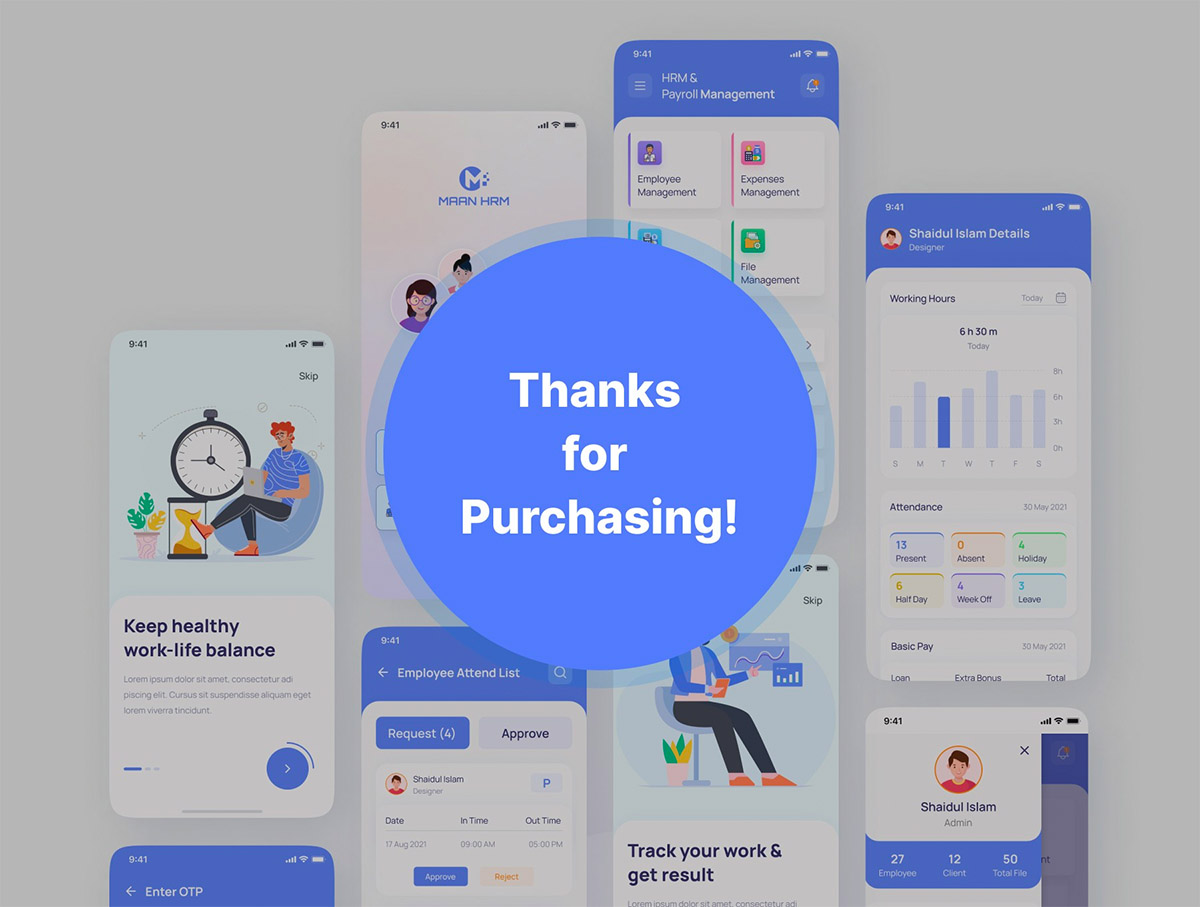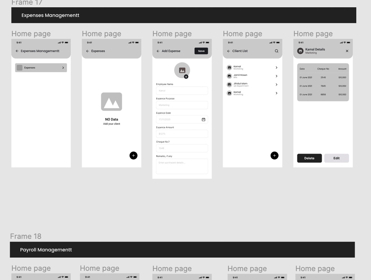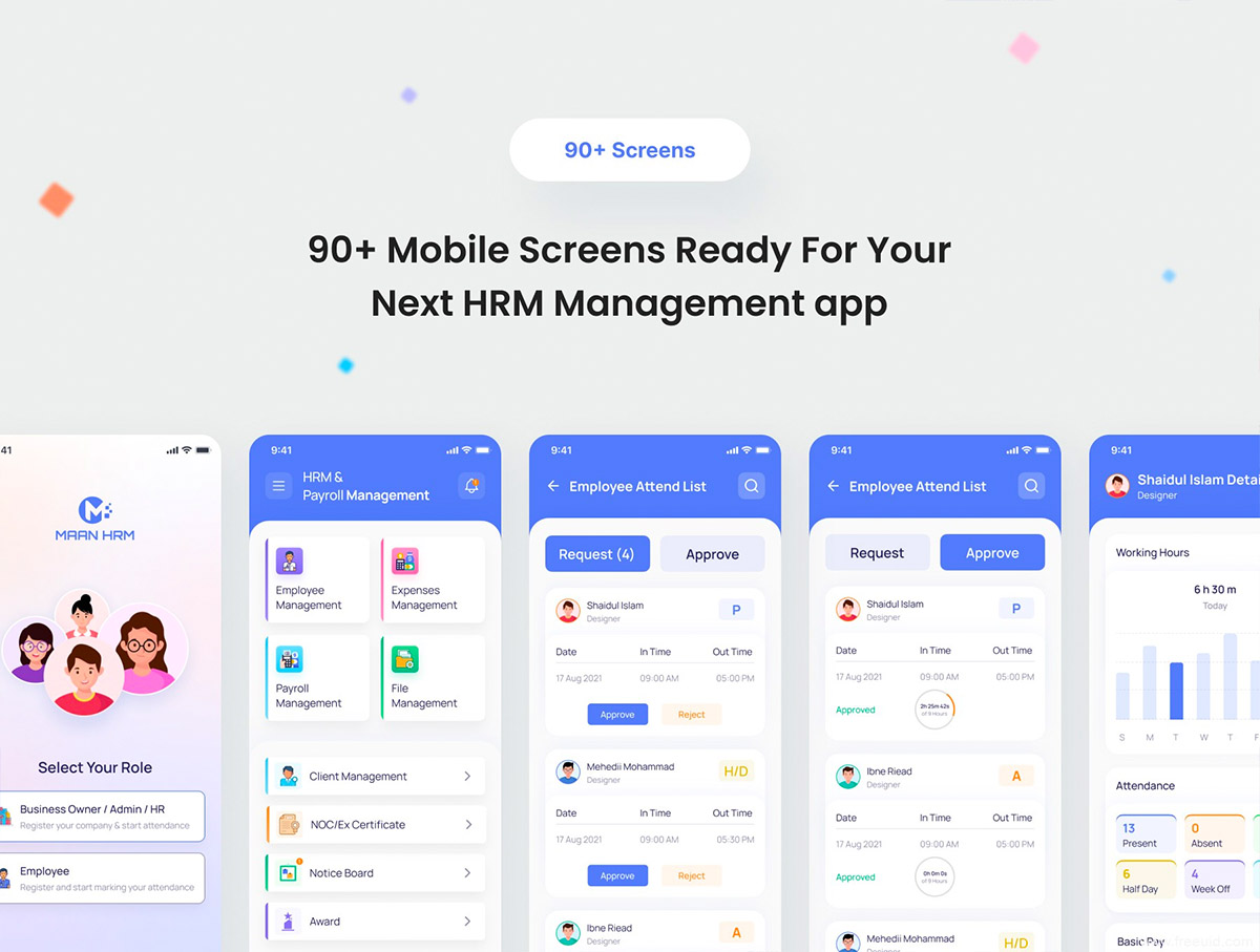 90页人力资源管理App应用程序UI套件,包含流程图和原型图