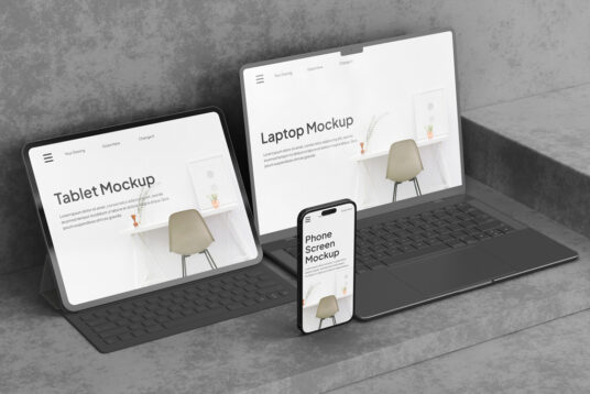 MacBook, iPad与键盘和iPhone呈现响应式网页和app设计的PSD文件