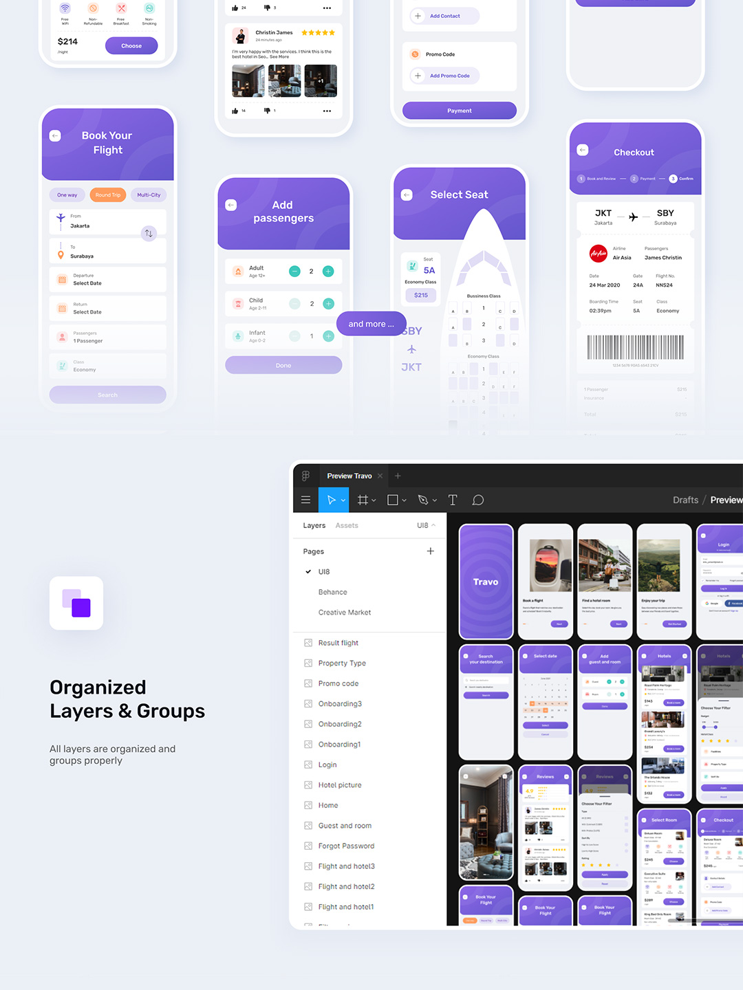 43页旅行,航班和酒店APP设计Figma、Sketch 、 XD、studio格式