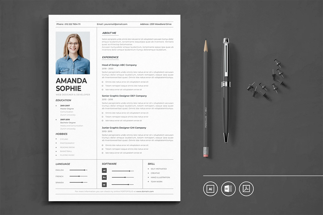 设计创意专业学生和应届毕业生加分简历DOCX.AI 和.PDF 格式