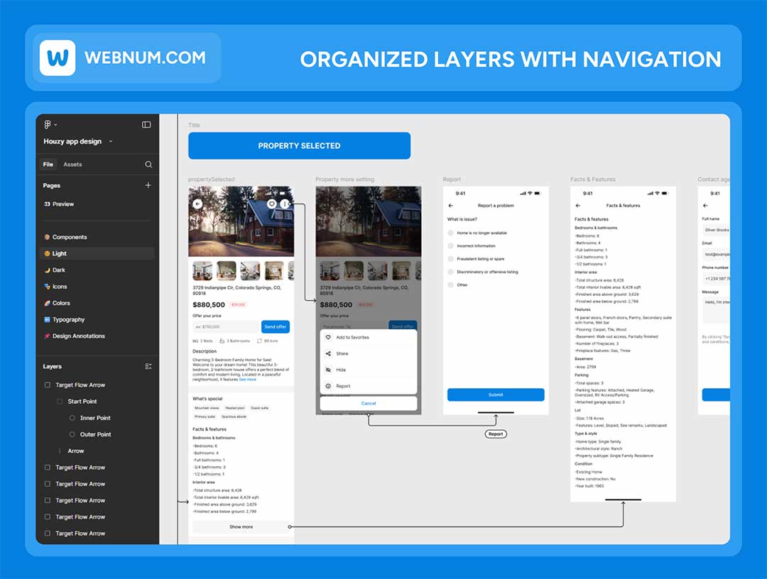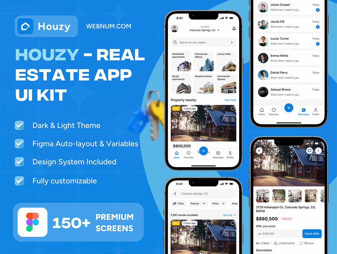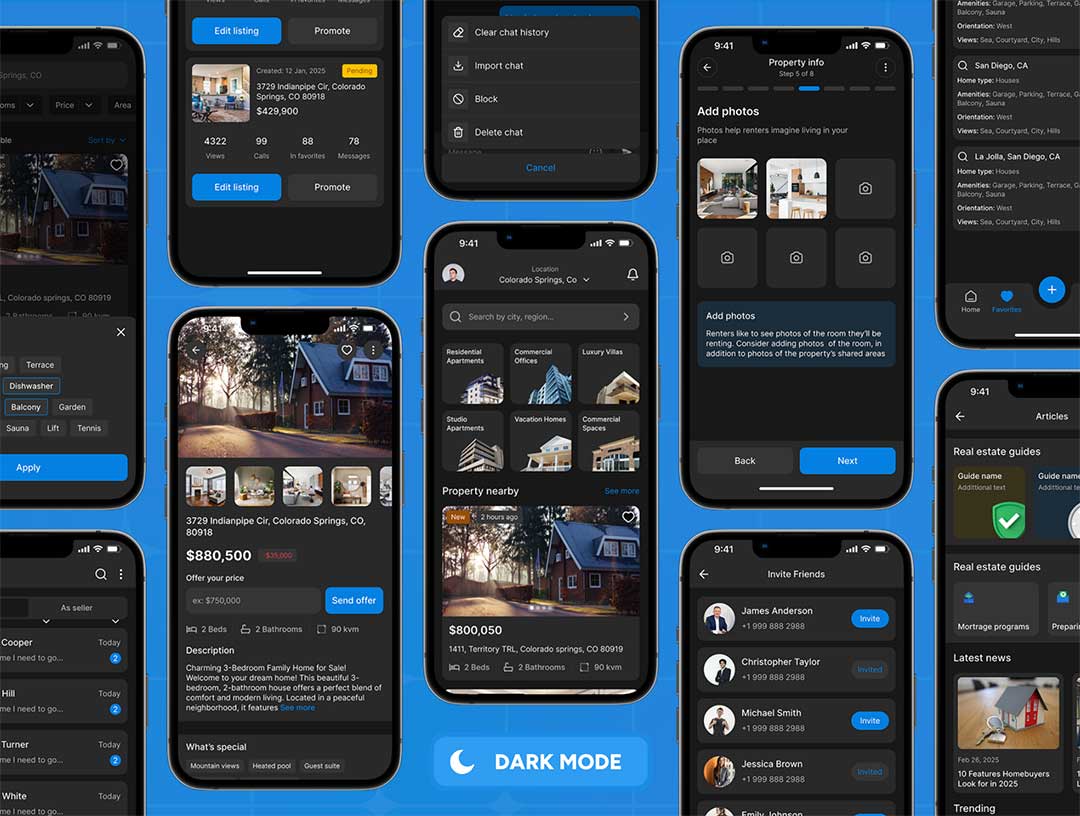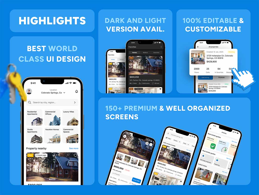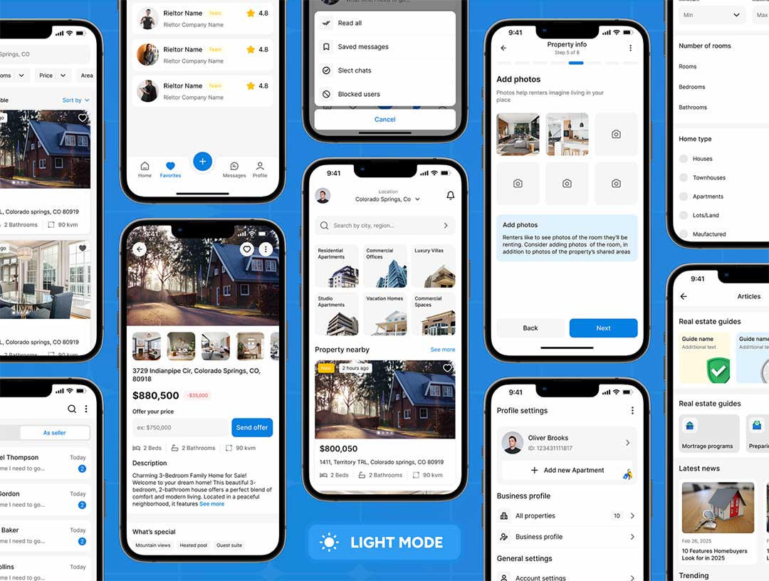 包含 150 多个精心整理的界面,覆盖完整用户旅程:房源信息流、高级筛选功能、地图与列表视图、房源详情、图片集、平面图、房源对比、收藏与保存搜索、与经纪人聊天、看房预约、报价、用户资料、通知、文章 / 博客等。